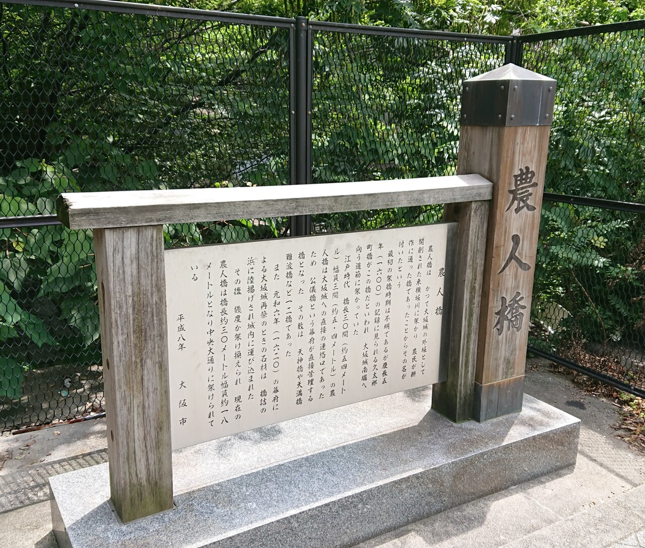 堺筋本町から大阪城へ向かう途中の東横堀川にかかる橋です、名前の由来は農民が耕作時に使っていたからだそうで、その後重要な橋として江戸幕府の公儀橋として管理されてきた橋だそうです、現在は橋の長さは30メートルほどで車がたくさん通っている橋です、何気なく通りすぎてしまいそうな歴史ある橋です。