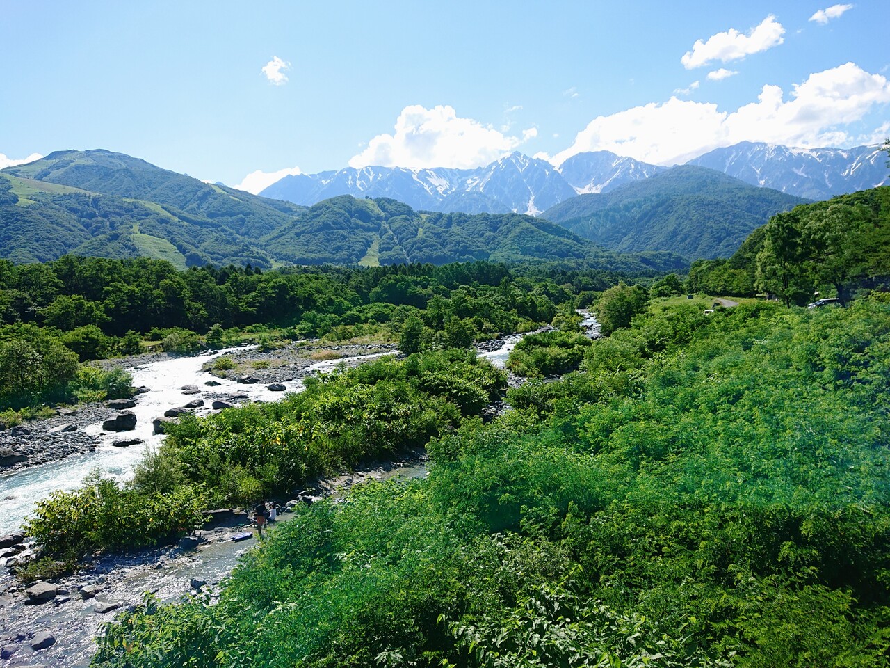 橋からの眺めは写真の通りで、渓流の向こう側に白馬の綺麗な山並みが見えます。