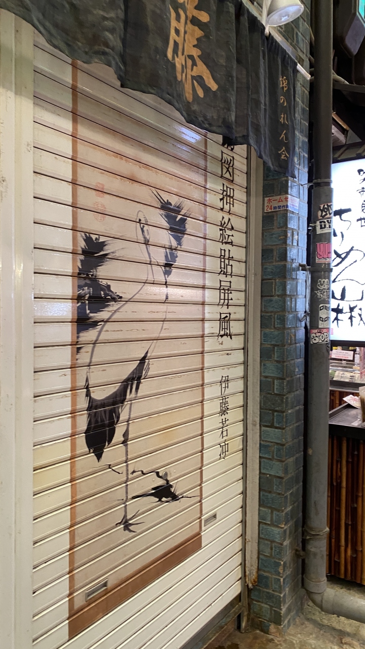 錦市場というよりも錦の一言で通じます。狭い通路の中いろいろなお店があるので、ちょっと見ているだけでも面白い地区です。ただ、夜はほとんどのお店が閉まってしまいます。ただ、最近、伊藤若冲の生家跡がある関係か、ここのお店のシャッターに伊藤若冲の絵が描いてあるのです。閉店後はこれらを見るのも一興です。