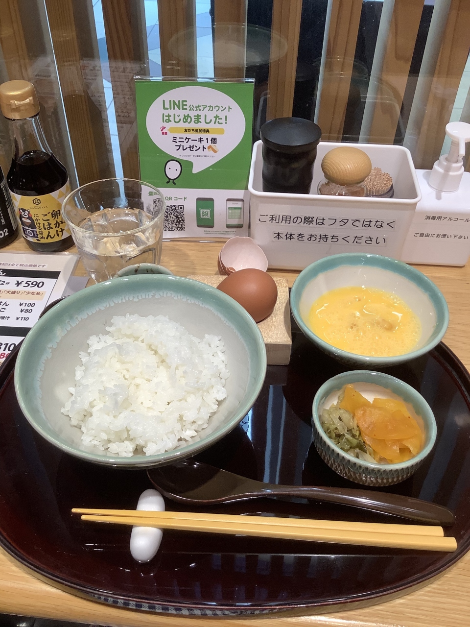 羽田空港第1ターミナル、京急の乗り場近くにある赤坂うまやうちのたまご屋さん、出張があり羽田に朝食がまだだったのでうちのたまご屋さんに卵かけご飯を食べてみました。親子丼とかもありますが朝だったので普通に卵かけご飯、たまこ2個までご飯も2回お代わりできます。専用のお醤油もあって、食べ方色々