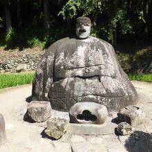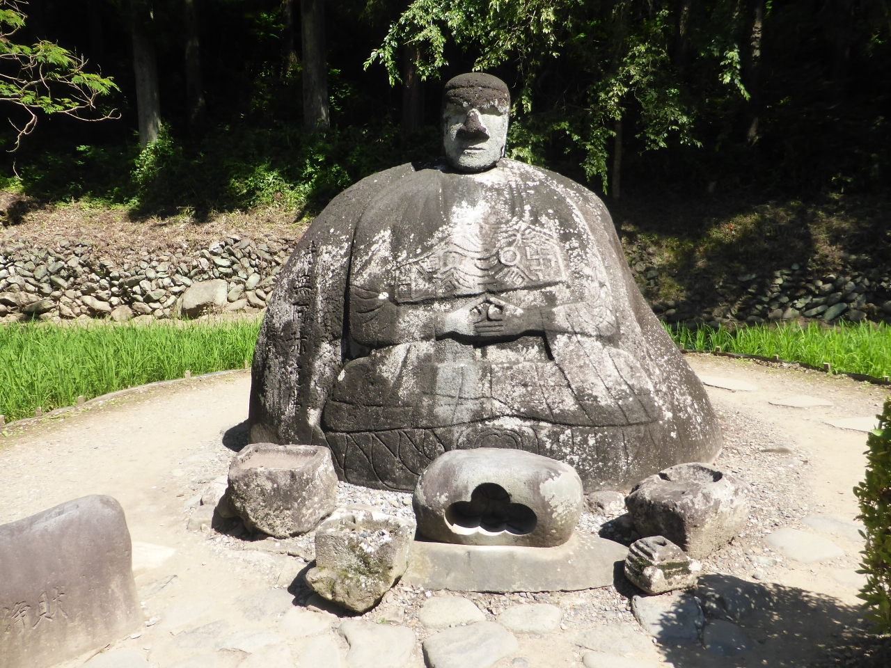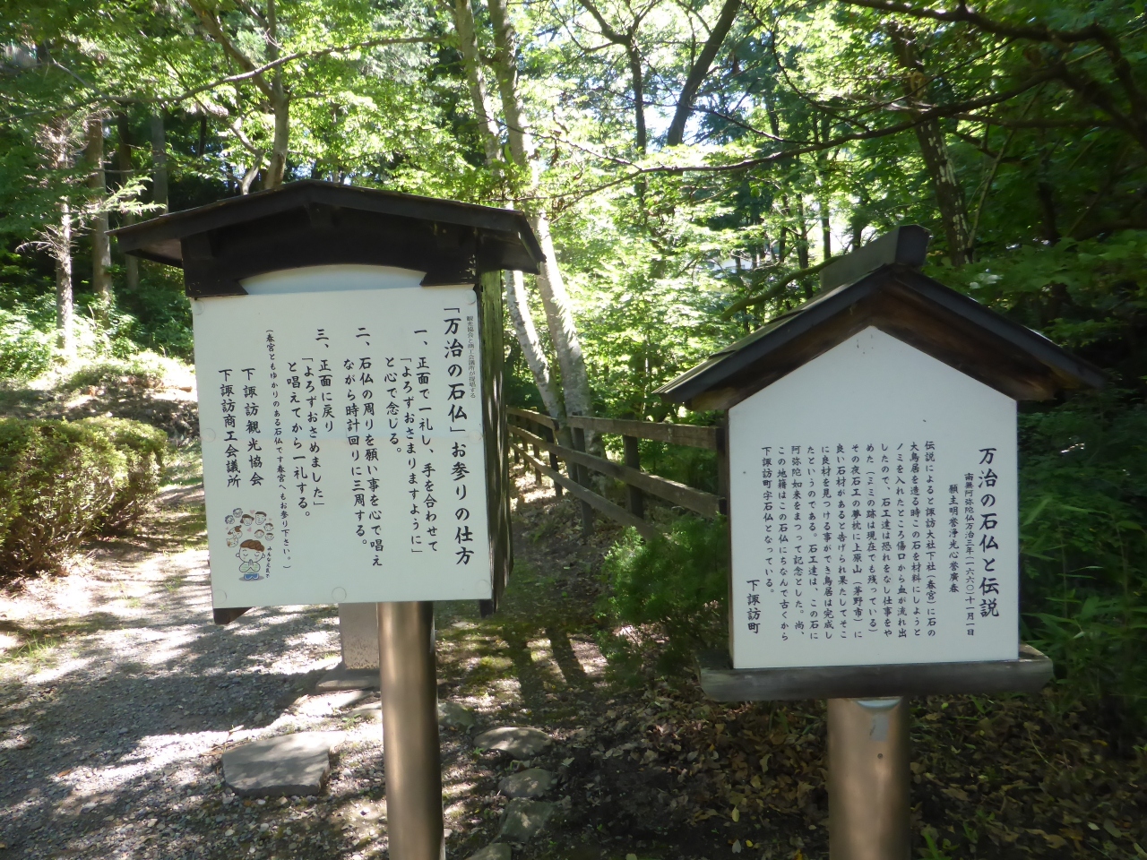 諏訪大社下社春宮の脇を流れる砥川沿いにある石仏です。高さ2mほどの半球状の石の上に頭が乗ったユニークな形。諏訪大社の大鳥居を奉納する際大工がノミをいれたところ血が流れ出たという伝説が残っています。石仏の周りを願い事を心で唱えながら時計回りに三周すると願いが叶うそうです。みんな無言で回っていました。