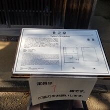 建物内部は大正期の仕立屋の仕事場を再現しており、仕立て途中の浴衣がっであったり仕事場としての一面とちゃぶ台に湯呑、庭の盆栽、玄関の下駄など当時の生活感もある。