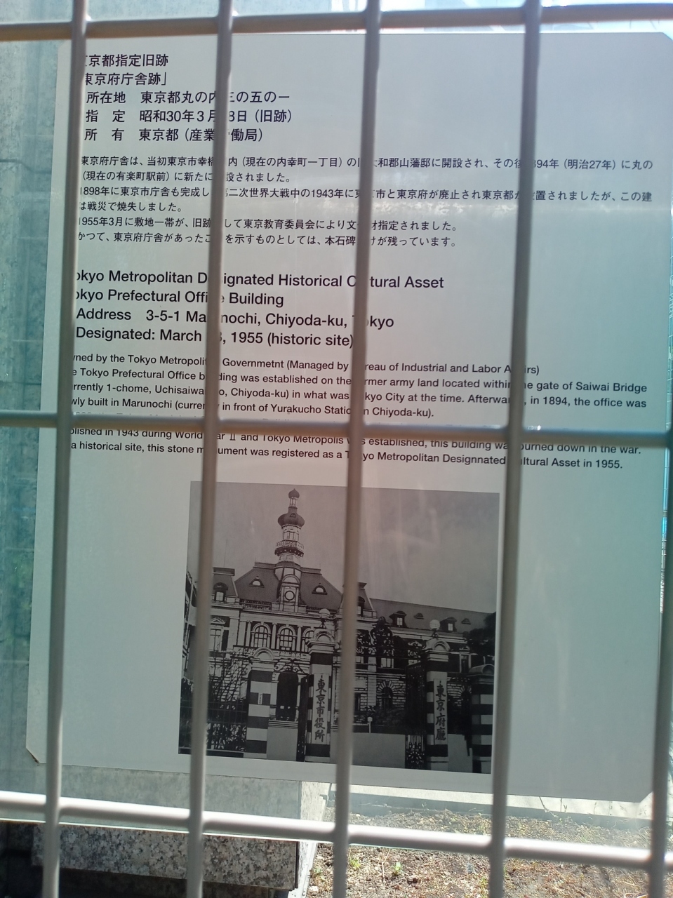 東京 丸の内にある東京国際フォーラムのKITTE側の入口に「東京府庁舎跡」の碑がひっそりとありました。