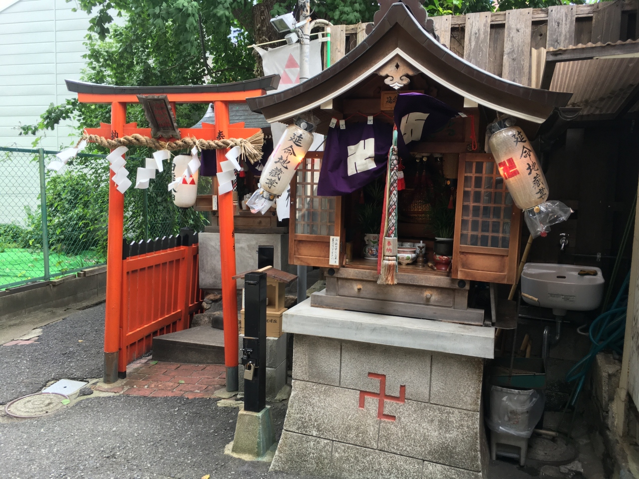 中崎町駅から歩いてすぐのところにあります。細い路地を入り奥まった場所なので、知らないと通り過ぎてしまうと思います。鳥居が印象的な小さい神社で、地蔵尊と並んでいます。周囲は昔ながらの古い町並みが残り、レトロな建物など下町風の庶民的な雰囲気があります。地元の方々から信仰を集め大切にされているように感じました。