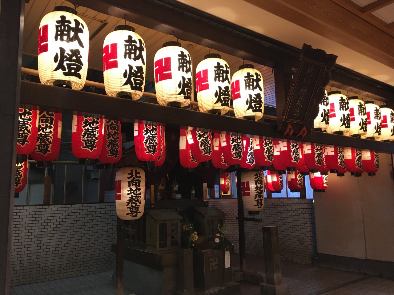 阪急梅田駅の茶屋町口にある紀伊国屋書店から、タクシーが列を成して並んでいる横断歩道を渡るとすぐ左手に見えます。赤い提灯が印象的ですが、少し奥まっているのでそれ程目立っていません。その名の通りお地蔵様が北に向いているのですが、北向きは下座になる為南を向いていることが多く、珍しいそうです。
