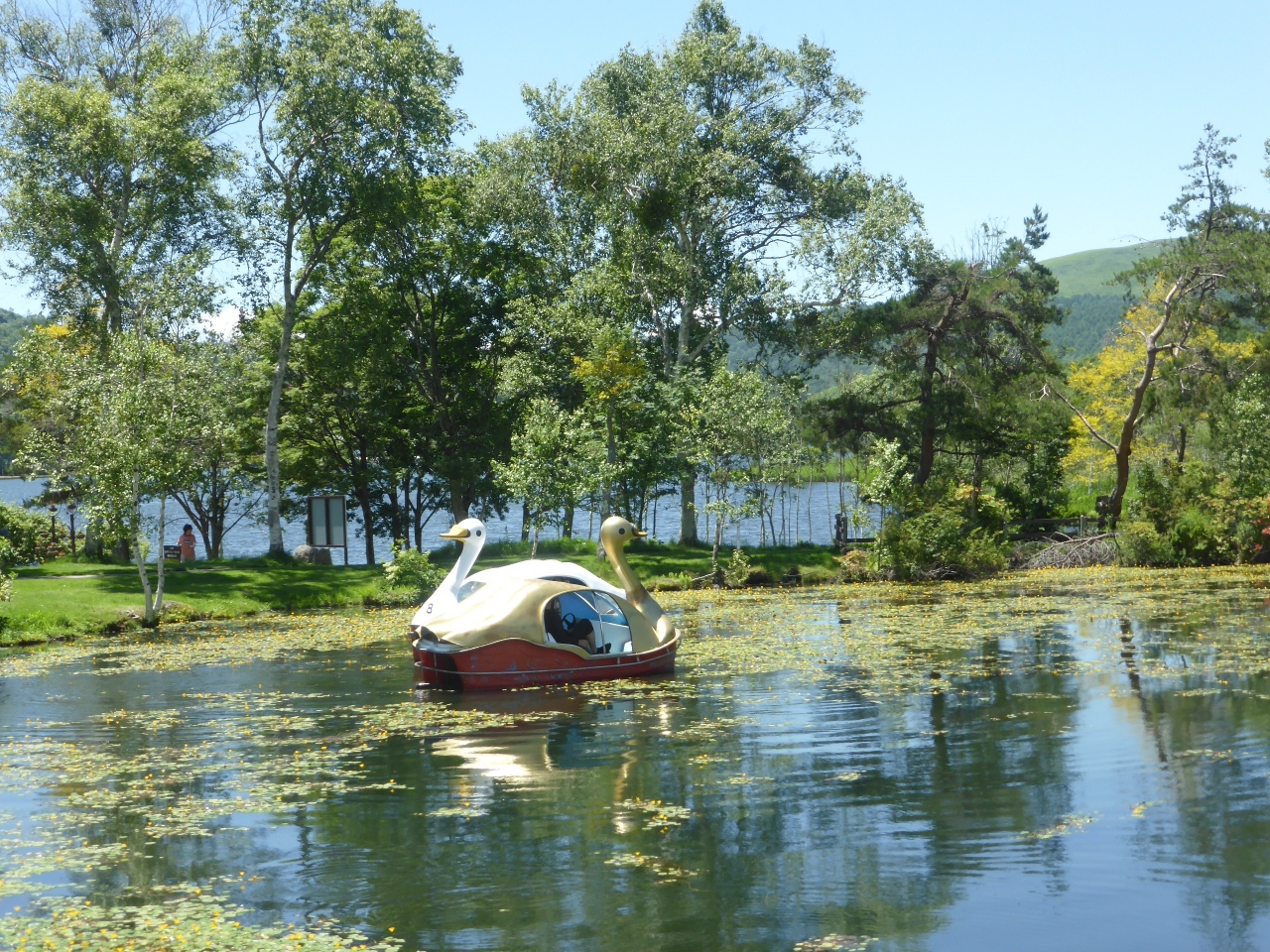 ビーナスライン沿い車山方面からドライブしていると眼下に見えてきました。緑豊かな高原の中に湖が浮かんでいるようでした。周辺は一大リゾートエリア、湖畔には遊園地や美術館、温泉、ローソンなどがあり多くの人で賑わっていました。白鳥のボートはいかにも観光地といった感じです。
