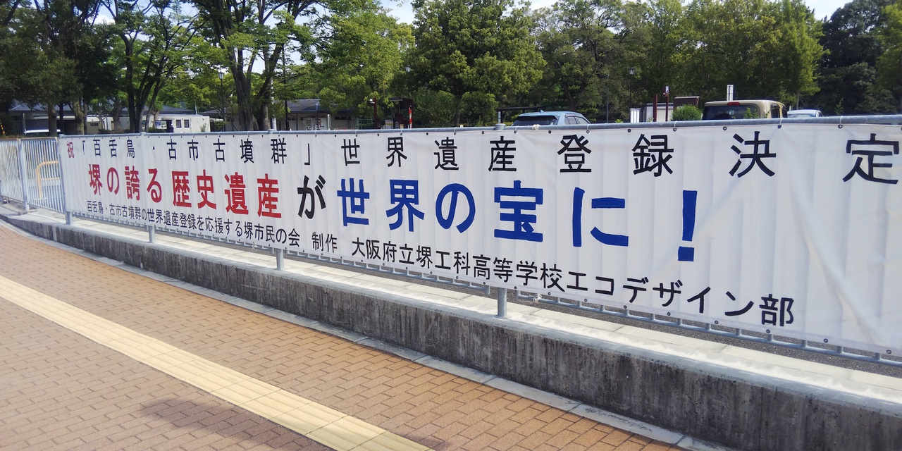 百舌鳥・古市古墳群は2019年に大阪初の世界文化遺産になりました。横断幕は仁徳天皇陵近くでみかけました。地元の方々の作成のようです。仁徳天皇陵のような、有名な前方後円墳だけではなく、方墳や円墳などいろいろあります。