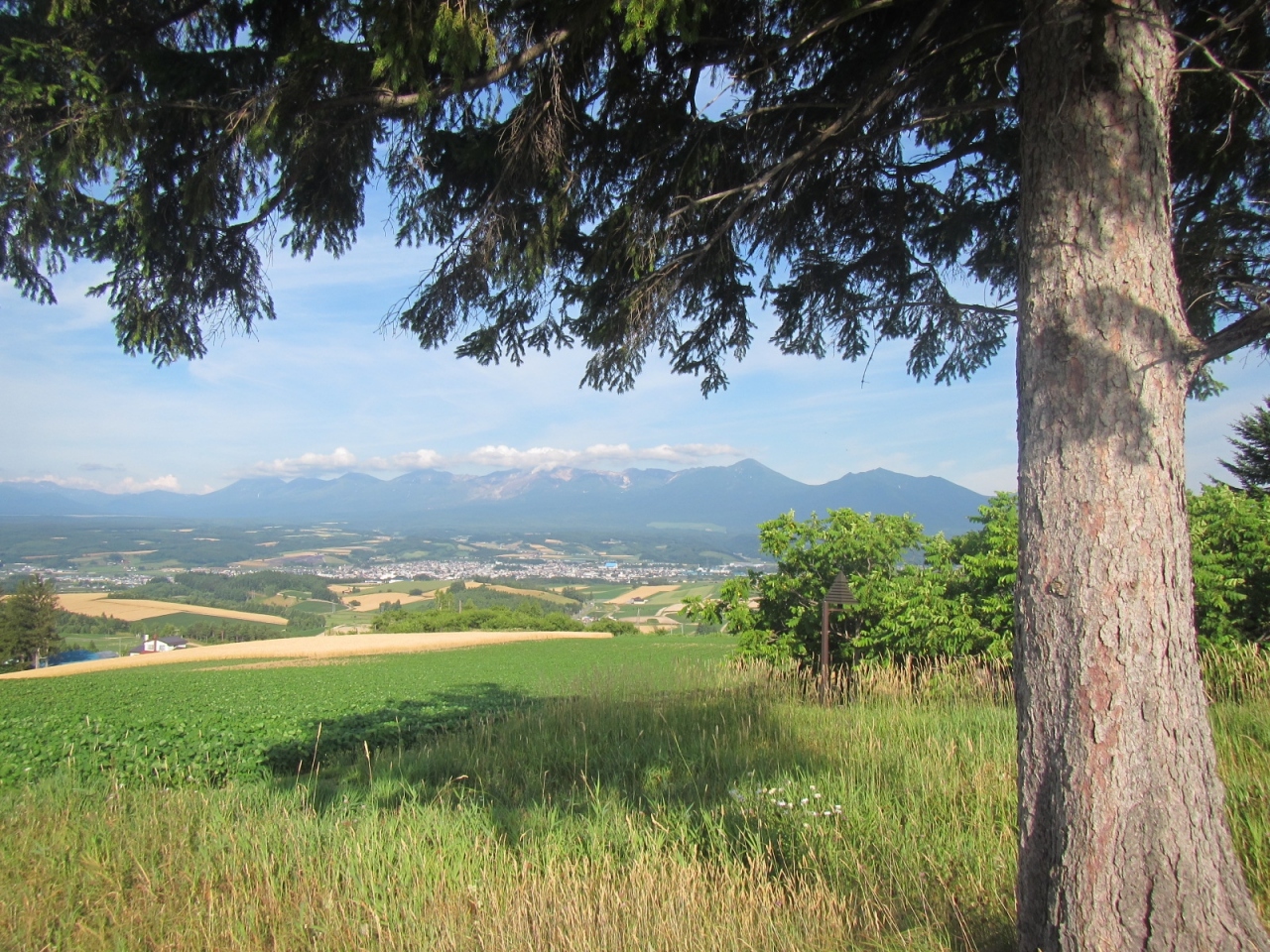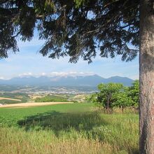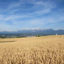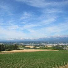 うねる丘陵上に広がる畑の風景の向こうに富良野盆地、そして十勝岳連峰が連なる景色が見事な場所です。