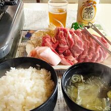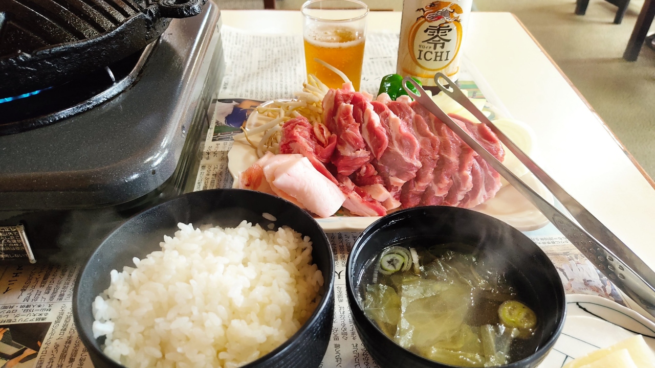 ジンギスカン鍋を使いますが北海道のジンギスカンと違い漬け込んでいない肉をそのまま焼くBBQ方式。付けダレはややあっさり目。