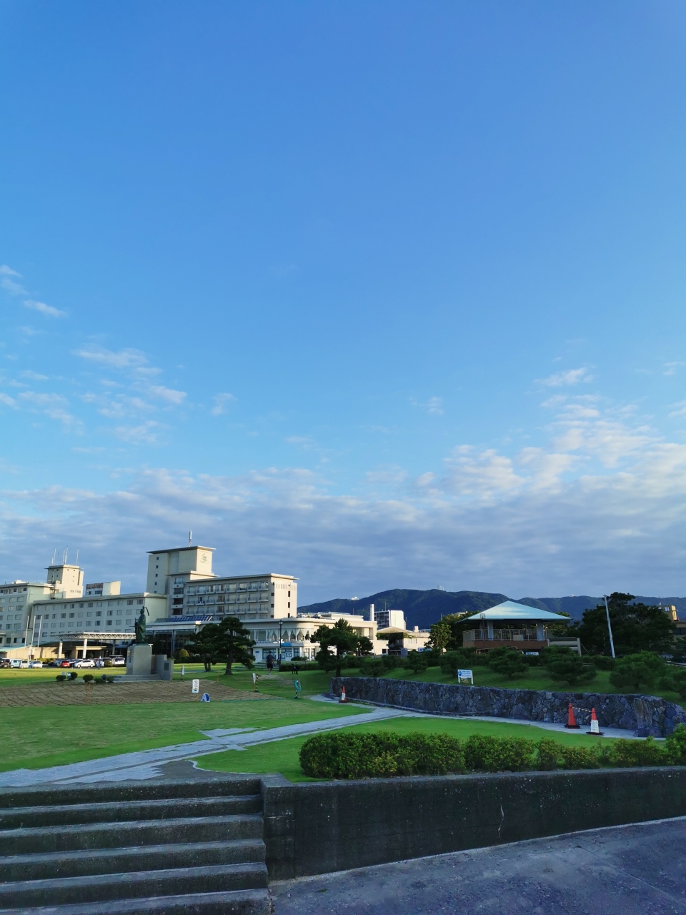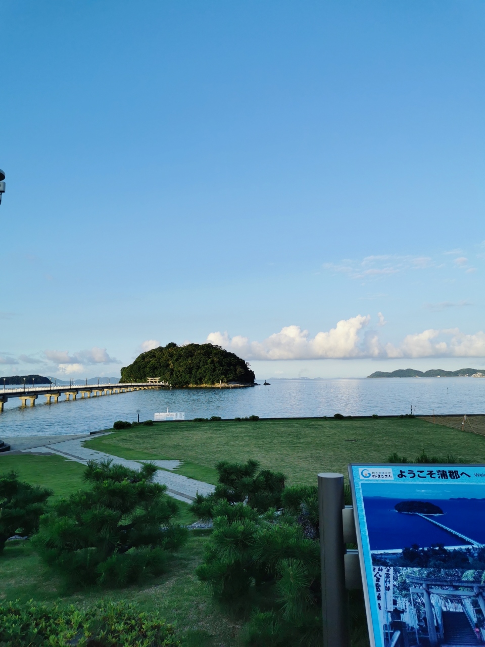 愛知県ドライブ旅。蒲郡の竹島へ。三河湾国定公園は愛知県の知多半島、渥美半島、三河湾沿岸が範囲の様です。広大なエリアの公園です。竹島園地には観光客用の有料駐車場があります。早朝6時前でしたので無料で入れました。目の前は三河湾。緑の芝生もしかれ、目の前は竹島と綺麗な海の光景でした。とても良い雰囲気でした。