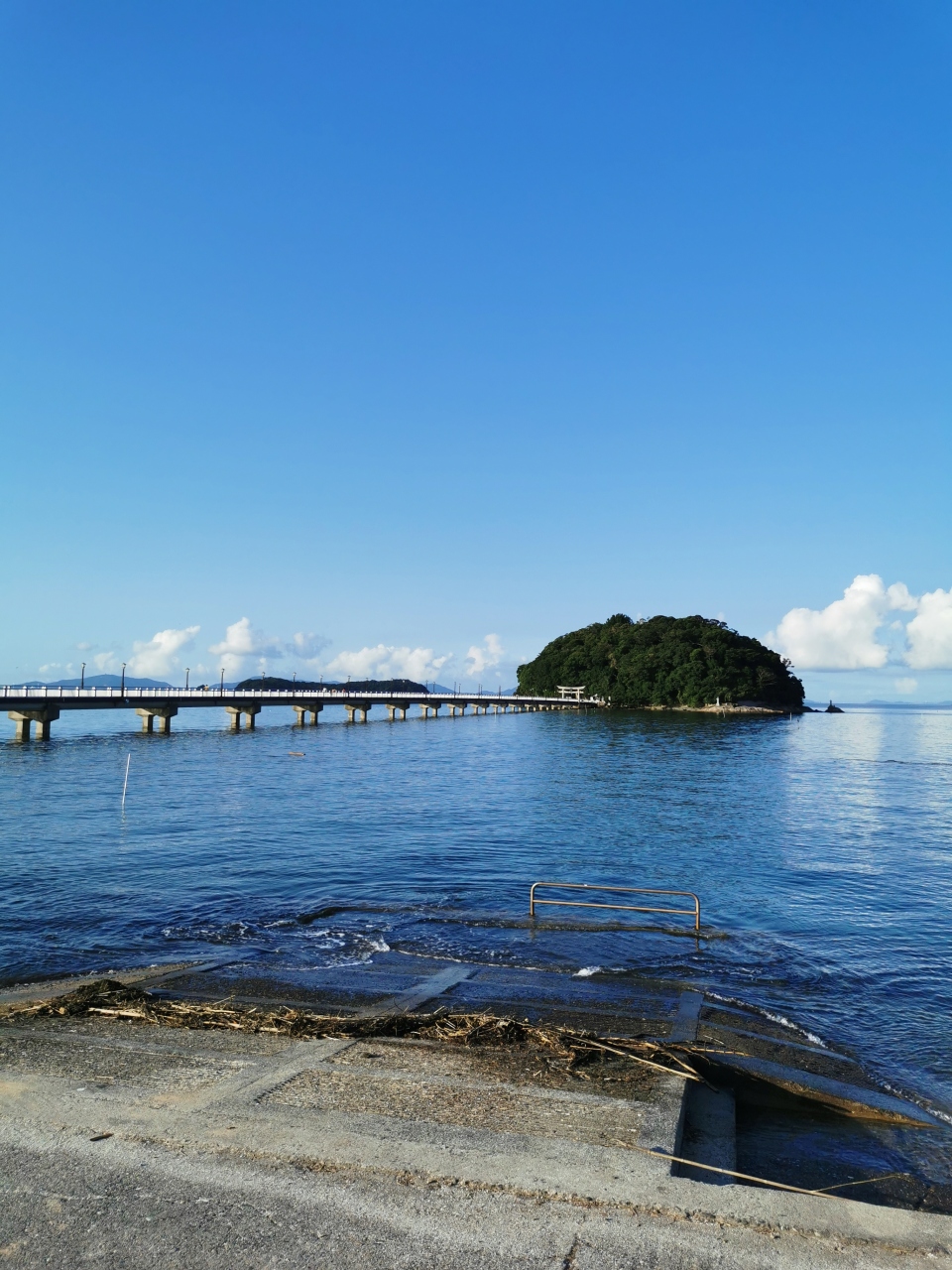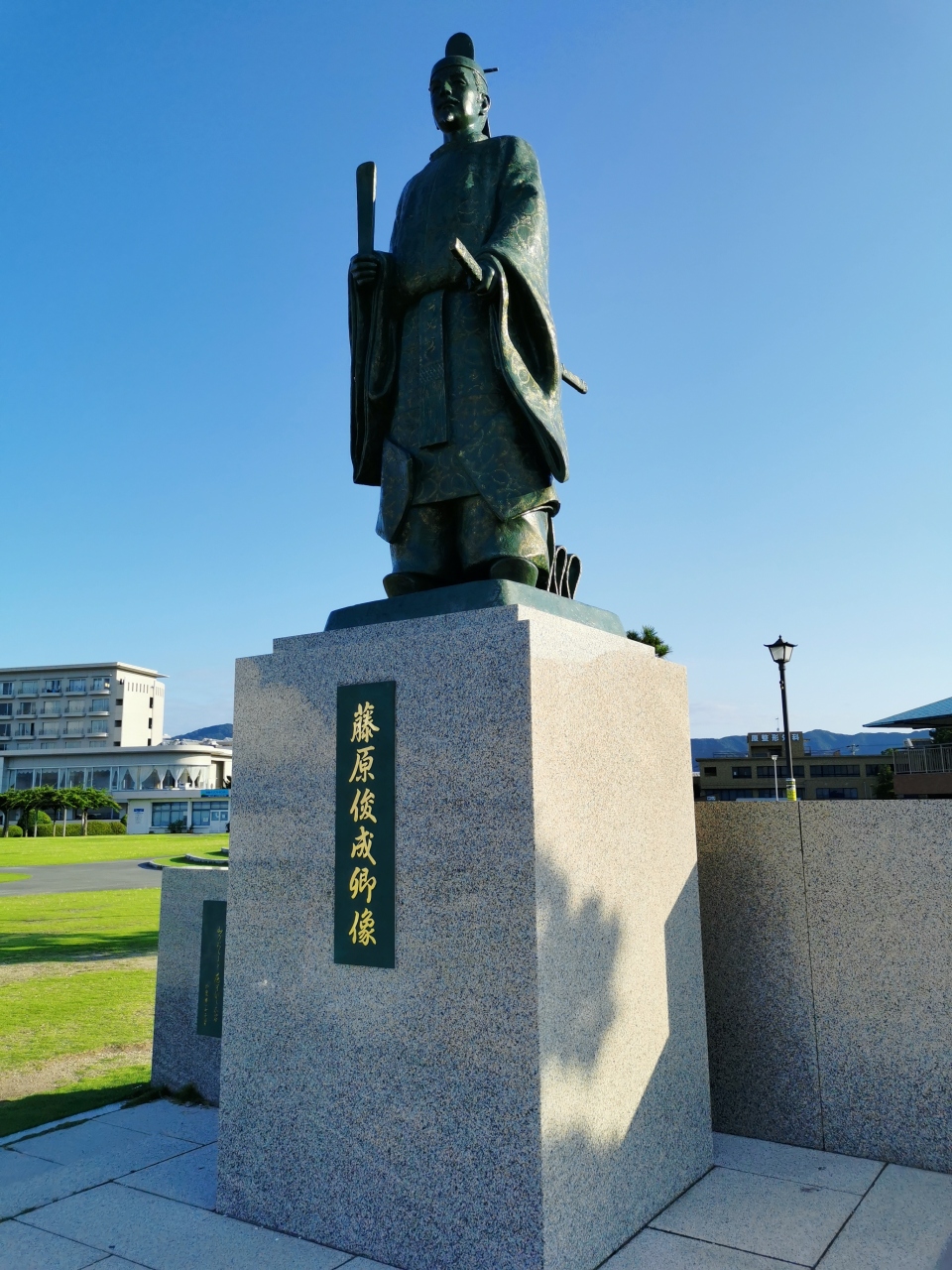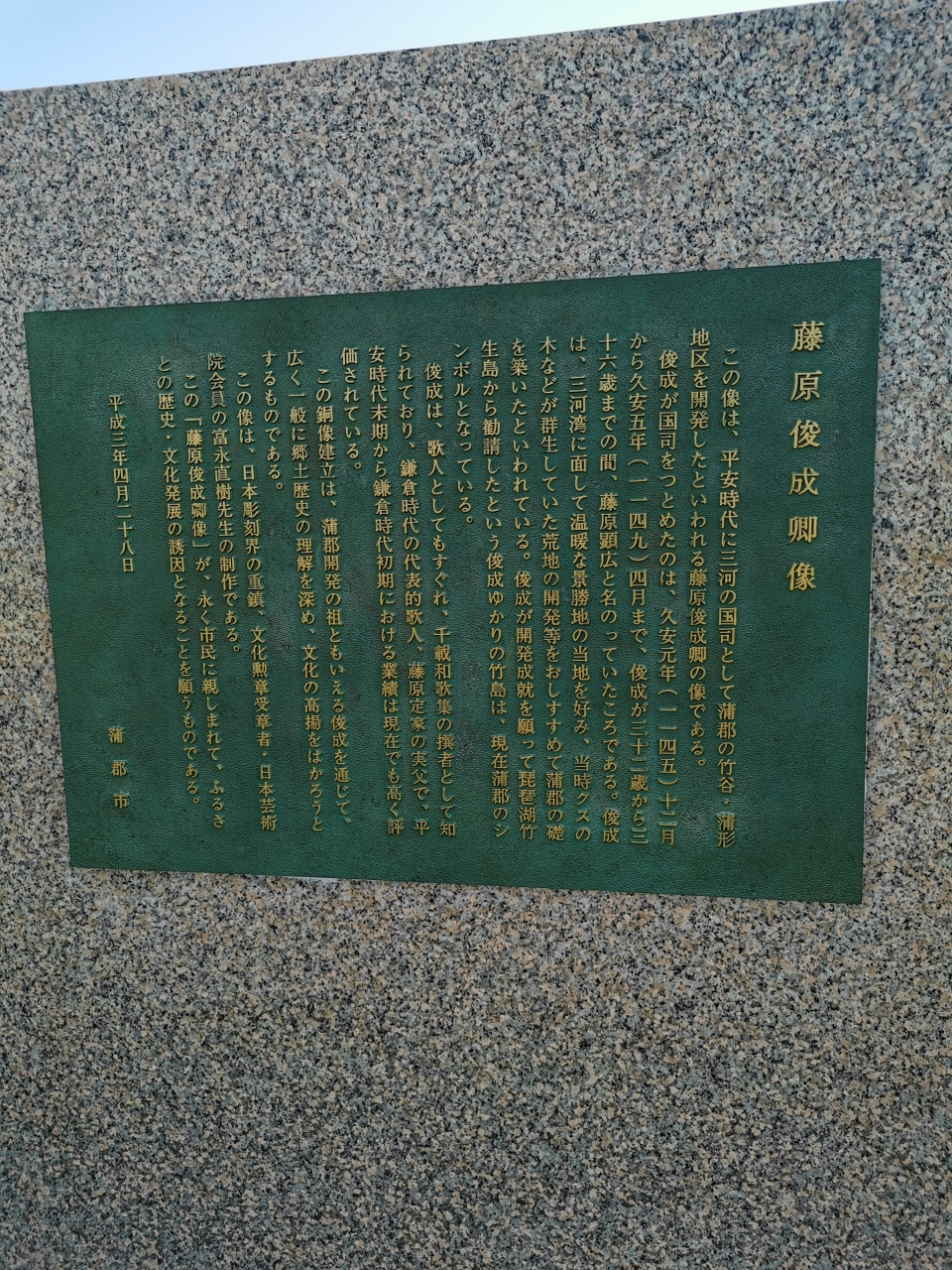 愛知県ドライブ旅。蒲郡の竹島へ。三河湾国定公園は愛知県の知多半島、渥美半島、三河湾沿岸が範囲の様です。広大なエリアの公園です。竹島園地には観光客用の有料駐車場があります。早朝6時前でしたので無料で入れました。竹島園地の緑の芝生の中に、藤原俊成の銅像が立ってました。なかなか立派な人物。目の前は竹島と綺麗な海の光景でした。とても良い雰囲気でした。
