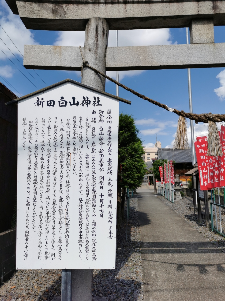 愛知県ドライブ旅。三河湾国定公園の竹島観光から徳川家康公の生誕地である岡崎市へ。岡崎公園駐車場(有料)に車を停めて自転車で岡崎散策しました。岡崎公園の乙川方向のお堀を渡って、八丁堀通りに行く途中の新田白山神社に参拝立ち寄りしました。境内の大くすは見応えがあります。
