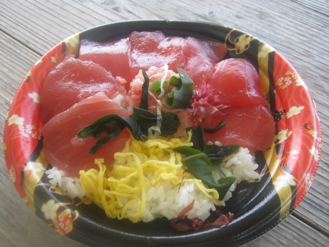 今回は糸満の道の駅を訪問した際、昼食をと考えて購入したのがこちらの沖縄県産まぐろ丼でした。それ以外にも色々な海鮮丼がワンコインで売られていて、どれも美味しそうなので迷いました。おさかなセンター内には幾つかのショップが並んでいますが、ここは向かって左手一番端にあるお店です。