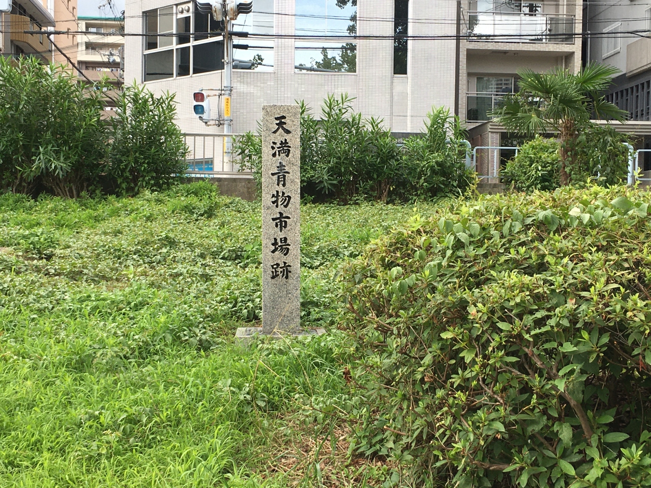 南天満公園にあるモニュメントの一つで、公園の散策路脇にひっそりと建っています。江戸時代に堂島米市場・雑喉場魚市場と並んで大阪の三大市場といわれました。大阪の青果物を独占的に売買し明治以後も大阪市の唯一の青物市場でしたが、1931年大阪中央卸売市場が成立し廃止されました。長い間に渡って存在していたことに驚きました。