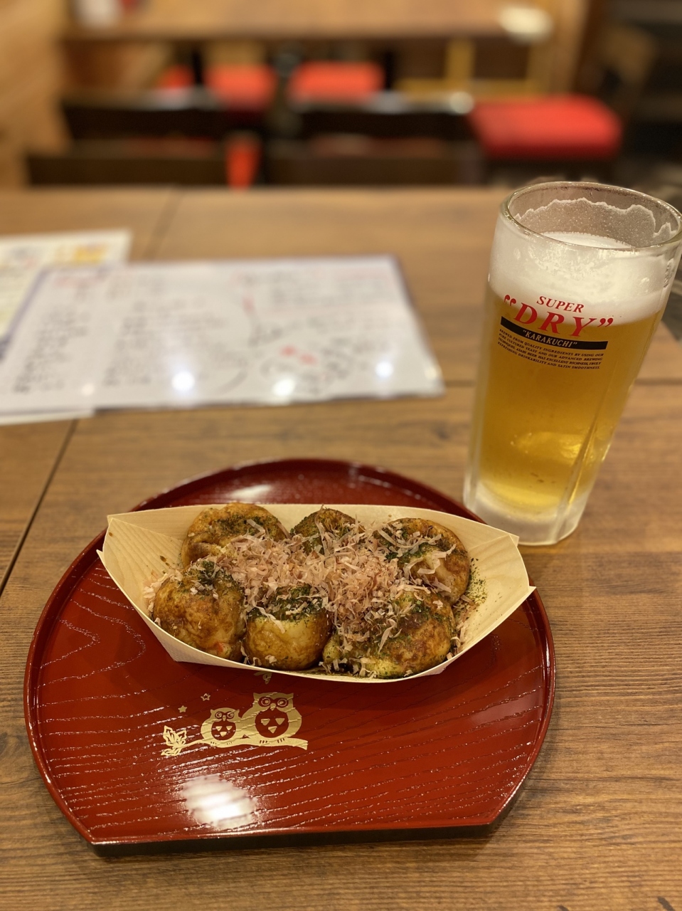 阪急池田駅にあるたこ焼き屋さんです。後輩の結婚式の前の腹ごしらえで利用しました。東京やその後の結婚式では生ビールが飲めない中で、大阪で生が飲めるのはありがたいです。たこ焼きも大阪らしいダシの効いたタイプ。美味しくて焼き鳥と地酒まで頼んでしまいました。
