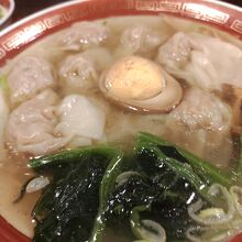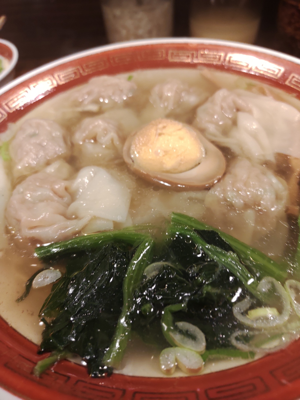 カウンターと一部テーブル席があります。カウンターには足元に荷物入れがあります。ワンタンメンはワンタンが大きく食べ応えがあり、調味料も卓上に数種類あり、色々楽しめます。ミニ丼は、スープ茶碗ぐらいの大きさです。