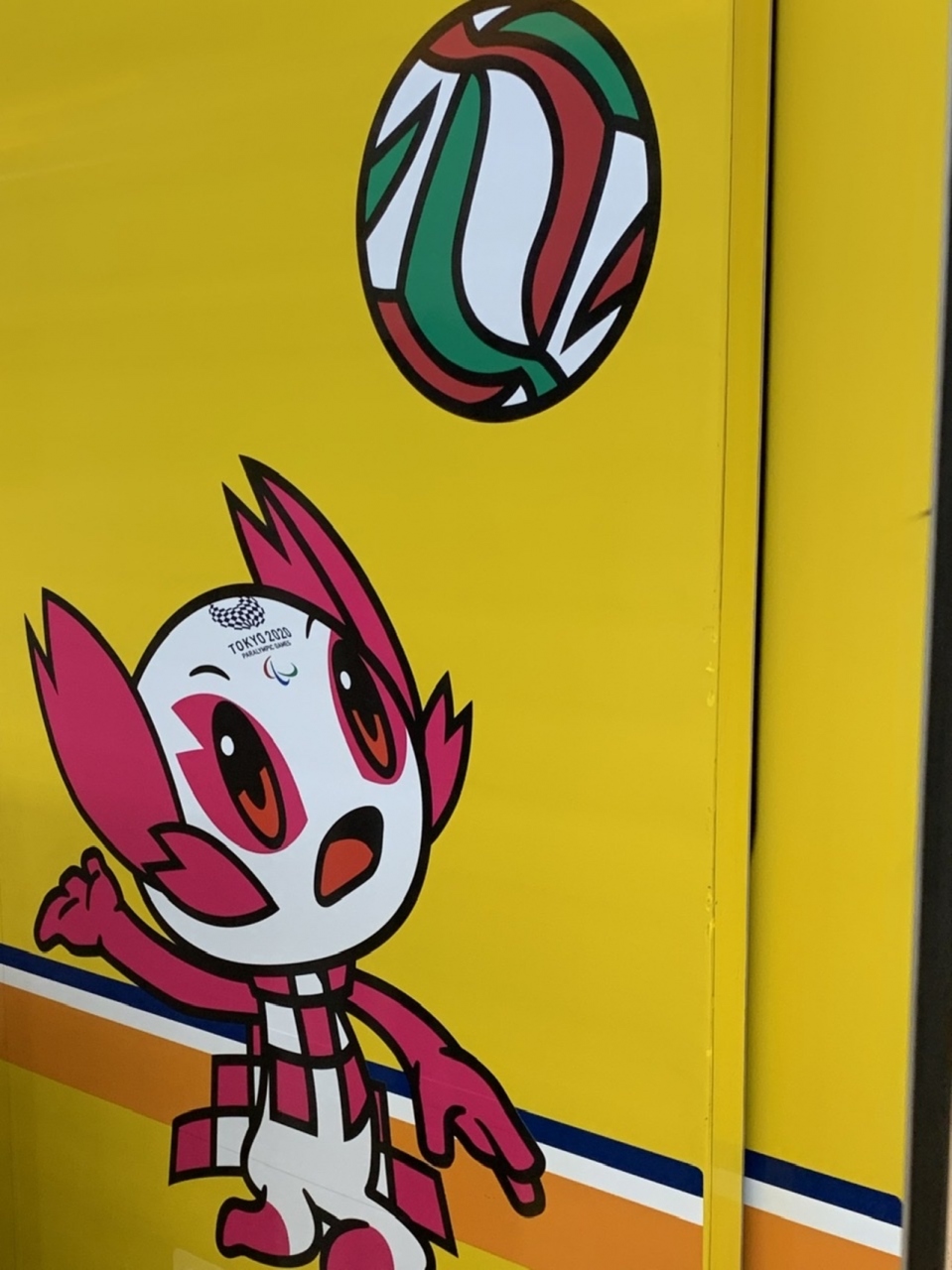時期的に車両にはオリンピックのマスコットが描かれ、車内にはボランティアの方の姿も見られます。