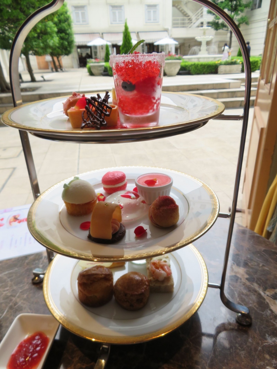 そして3段トレイに載せられたセットには薔薇や旬のイチゴの赤が目立ちました。