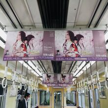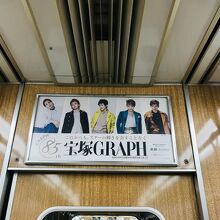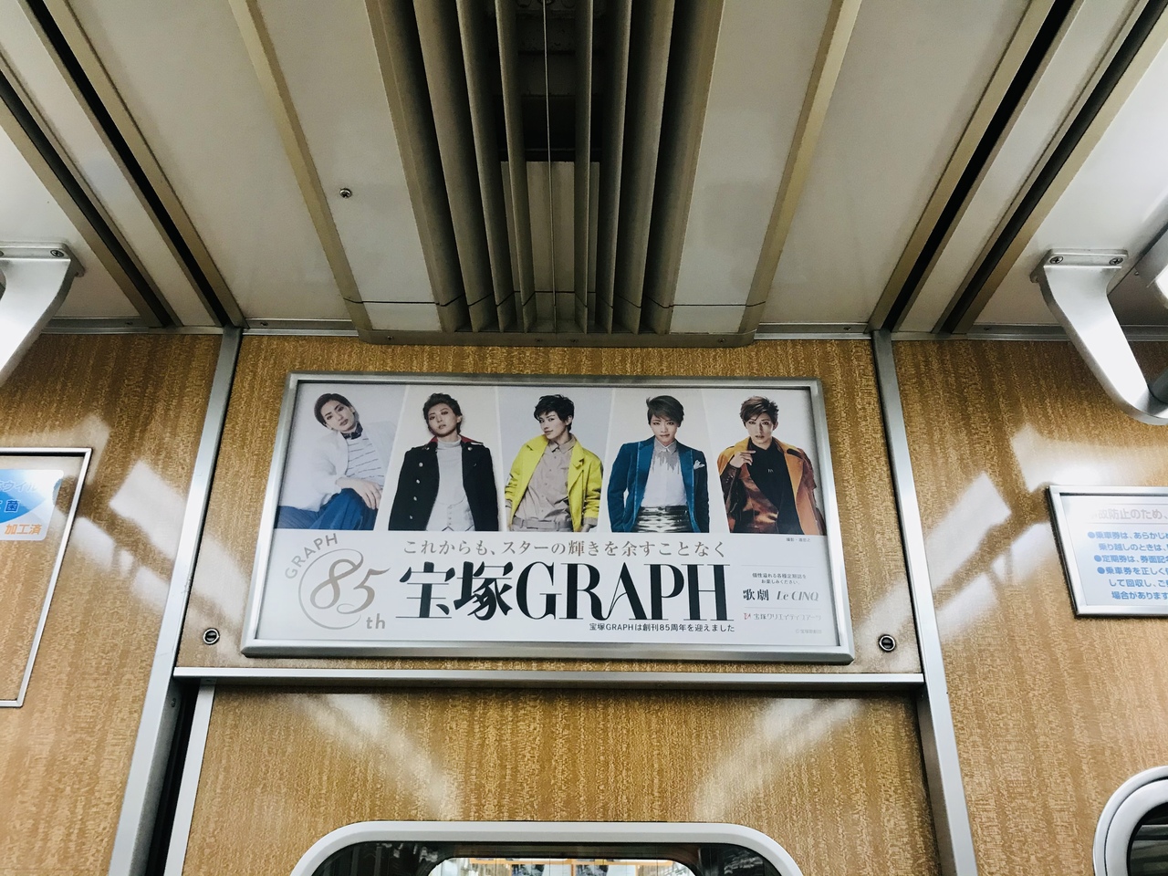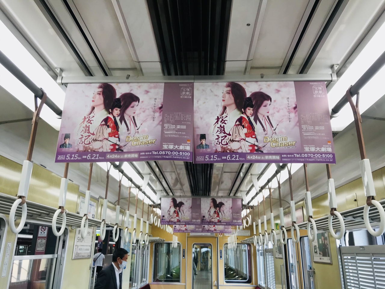 私は乗り換えるのが面倒なのでいつも宝塚線を使いますが、時々車内の宙吊り広告が1両全部宝塚!という時があります(裏面は別のポスター)。