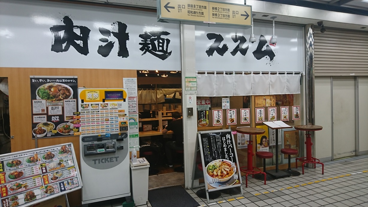 新橋駅汐留口駅前、新橋駅前ビル1階レストラン街にある肉汁麺専門店です。以前は担々麺のお店でしたが、いつの間にか肉汁麺専門店に替わっていました。夕食で肉汁麺レベル1(130g)800円をいただきました。具は豚肉数きれ、モヤシ、ネギで、背脂の浮いた動物系スープと、モチっとした極太縮れ麺の一品です。色も味もかなり濃厚なスープでパンチあり。ご飯が進みそうな男のラーメンの印象です。