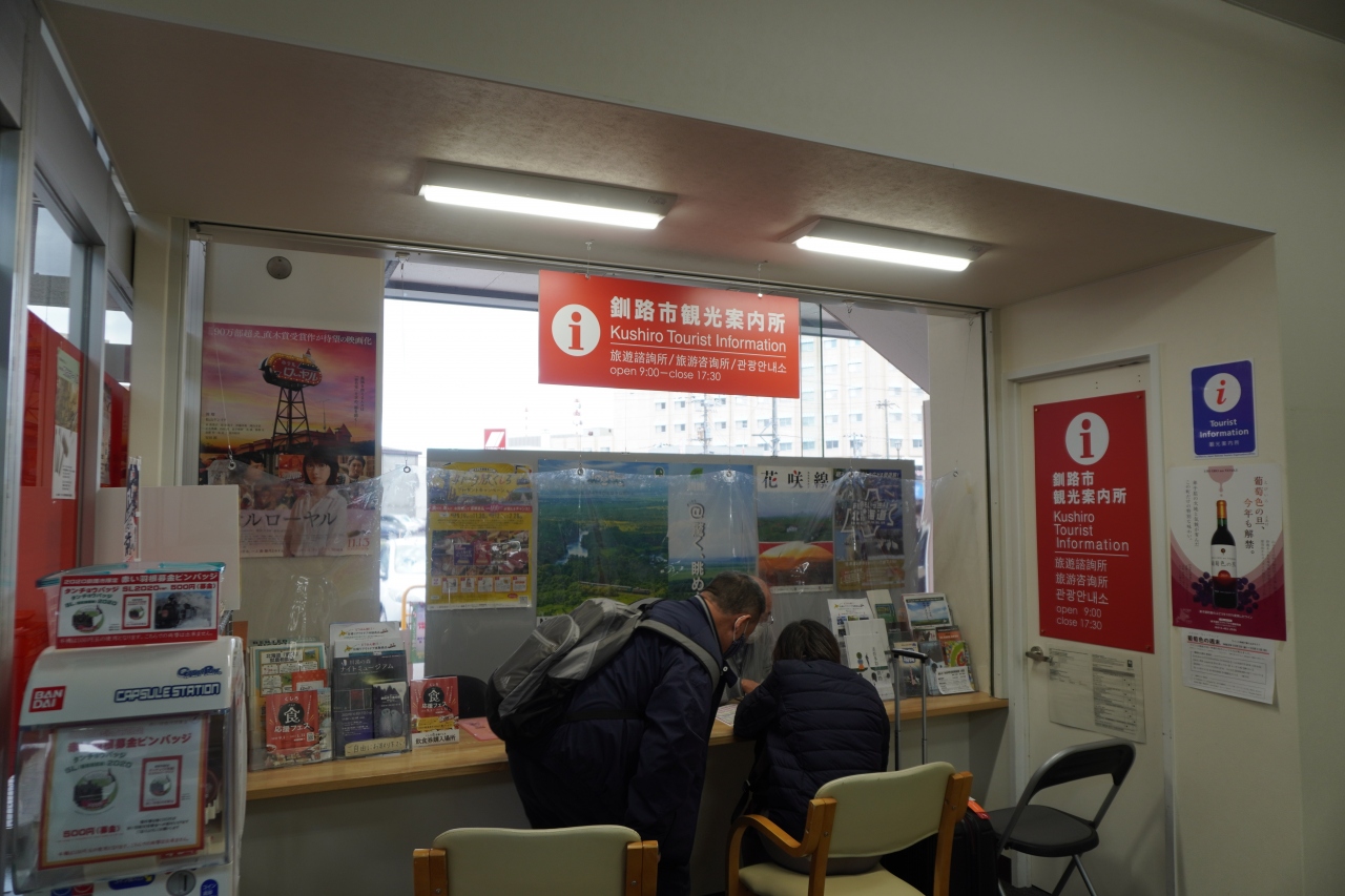 JR釧路駅釧路市観光案内所は、改札を出てすぐの右手側。おじさんが一人で対応しているだけなので、先客がいるとちょっと待つことになります。釧路食応援フェスの飲食券を取り扱っていてちょっと迷いましたが、参加店が少し少ないかな。もう少しちゃんと事前に下調べしておけばよかったかなと思いました。