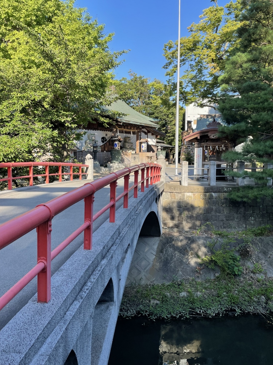 松戸駅西口からも近い坂川沿いにある神社です。坂川も以前に比べてきれいになり、清流の雰囲気もあります。参道はその坂川を橋で渡り境内に続いています。境内社も多く、通りすがりの地元の人たちが手を合わせていきます。