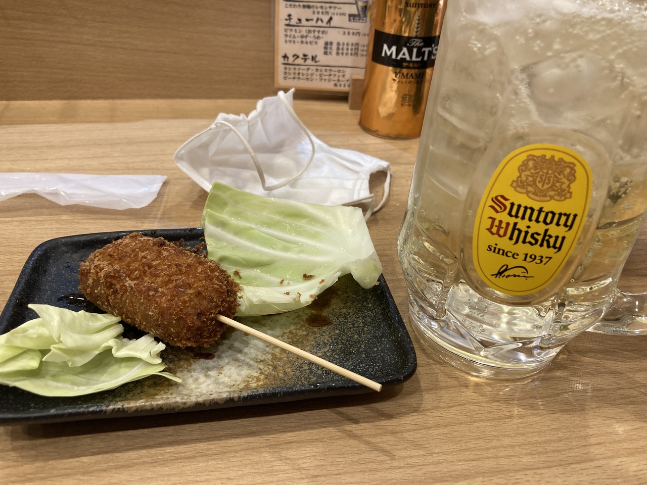 天神橋筋の高速の下にできた新店舗。店外のスペースでも食べられる。日陰で風も通るので、コロナの時期にはありがたい。他店ともども1杯目のドリンクは¥100。やっぱり夏は串カツにビールで決まりやね❗️