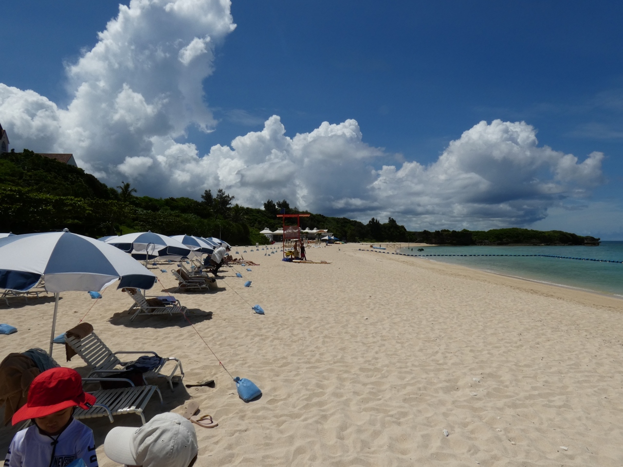 ホテル日航アリビラの目の前の東シナ海に広がる遠浅のプライベートビーチ。50m沖にブイで囲まれた透明度の高いビーチで、砂浜にパラソル付きチェアが揃っています。アクティビティもありますが緊急事態宣言下で営業してませんでした。ゆっくり出来るビーチです、ビーチの後はプールで。