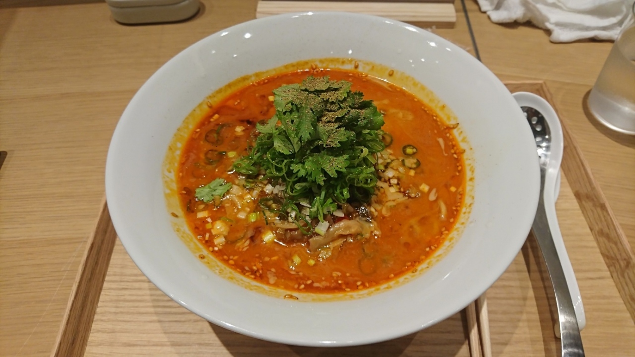 港区虎ノ門1丁目の虎ノ門ヒルズ ビジネスタワー地下1階レストラン街にある担々麺専門店です。夕食で 担々麺(並)950円をいただきました。具は肉味噌、ザーサイ、ネギ、パクチー、白胡麻で、中太麺と橙色の胡麻風味スープの担々麺。辛さ不足は残念でしたが、上品な旨味のあるスープはかなりの高レベル。麺にスープがよく絡み美味しくいただきました。