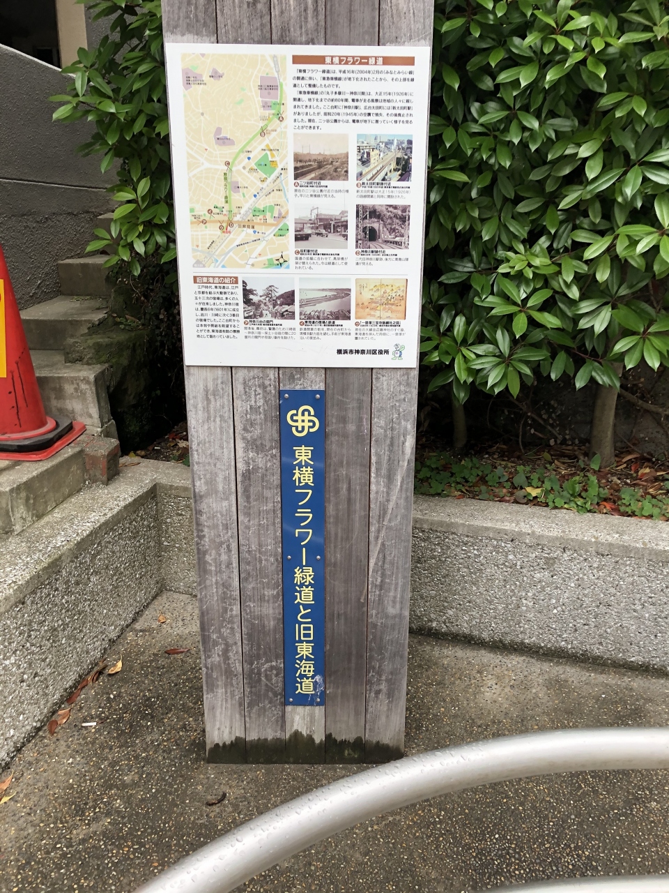 花壇のあるプロムナードと大きなトンネルから成っています。花壇にはアジサイやゼラニウムが咲いていました。人通りは多くて、地元の人にはとても便利な道なのでしょうね。入口には昔の東横線の写真や東海道の写真などの入った案内板も設置してありました。