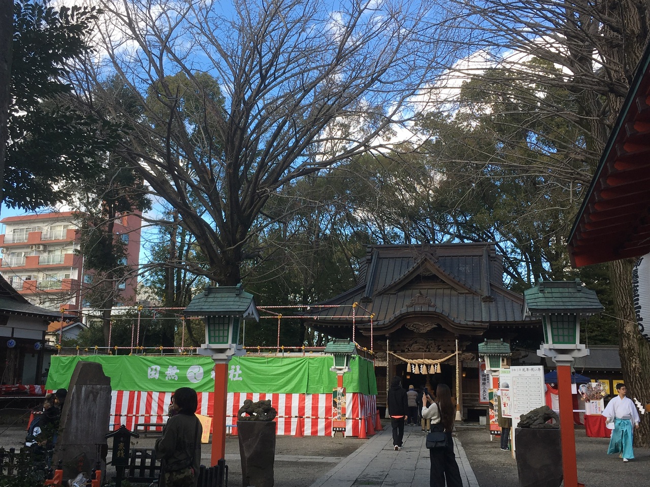 田無神社の境内には五龍神に見立てた5本の御神木があります。そのうちのひとつ、金龍神のいちょうは唯一の雄株です。いちょうの木で秋には境内は落葉で黄色い絨毯のように埋め尽くされます。道路をはさんだ総持寺には大ケヤキの木もあります。