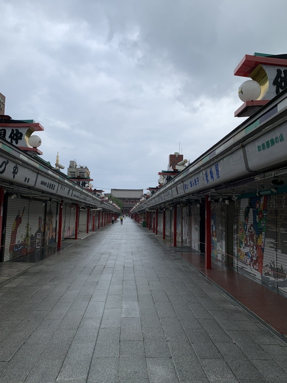雷門から浅草寺に向かう仲見世の通りはコロナ禍で全然人がいないようです。