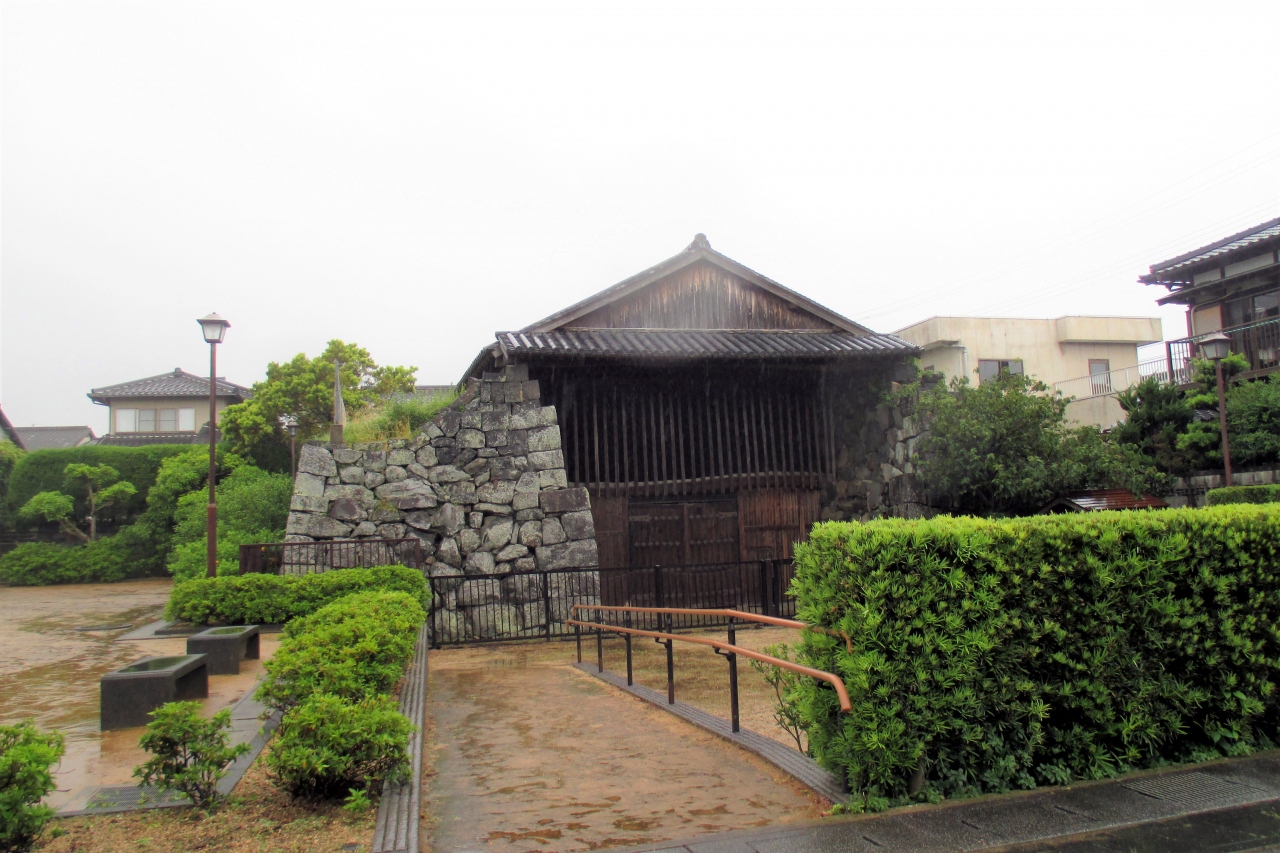 旧萩藩御船倉は、松本川岸から入江の様に掘り込んで造った船溜まりの奥にあったのですね。今は、船溜まりは埋め立てられ、さらにもっと先まで埋め立てられて様子がすっかり変わってしまっていますから、おかに上がったかっぱ状態でした。間口が8.8m、高さも8.8m、奥行きは27mとのことです。この船倉は1608年(慶長13年)の築城とほぼ同時期に造られたそうですから、非常時の使用が視野に入っていたのでしょうね。3棟建てられ、これが真ん中の大きいもので、南北に少し小さな船倉があったそうです。現在、南側には広場が造られていますが、これがその船倉跡(1962年(昭和37年)に解体)ですから、往時の全体の大きさが想像できます。余談ですが、後年に描かれた、船倉が4棟の絵が残されているそうですが、実景ではないと思います。船溜まりは周囲を石組で固めてあったはずですから、そう簡単には広げたり縮めたりは出来ないと思うからです。