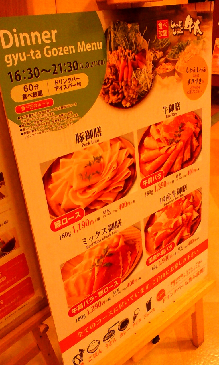 この日は60分食べ放題のコースで入ったのですが、豚ロースや牛肩バラ肉など様々なお肉や、野菜、ご飯、うどん、カレー、アイスなどが食べ放題になって1190円~となかなかコスパが良く、駅前でのお買い物の後にがっつり食事していくのにもってこいでした。