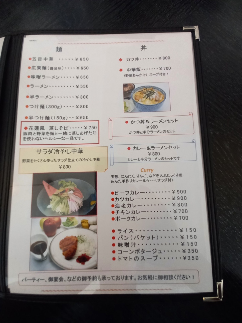 (花蓮)メニューは、ステーキやハンバーグ、カツやフライ、パスタにピザ,ラーメン,カレーと多彩です。