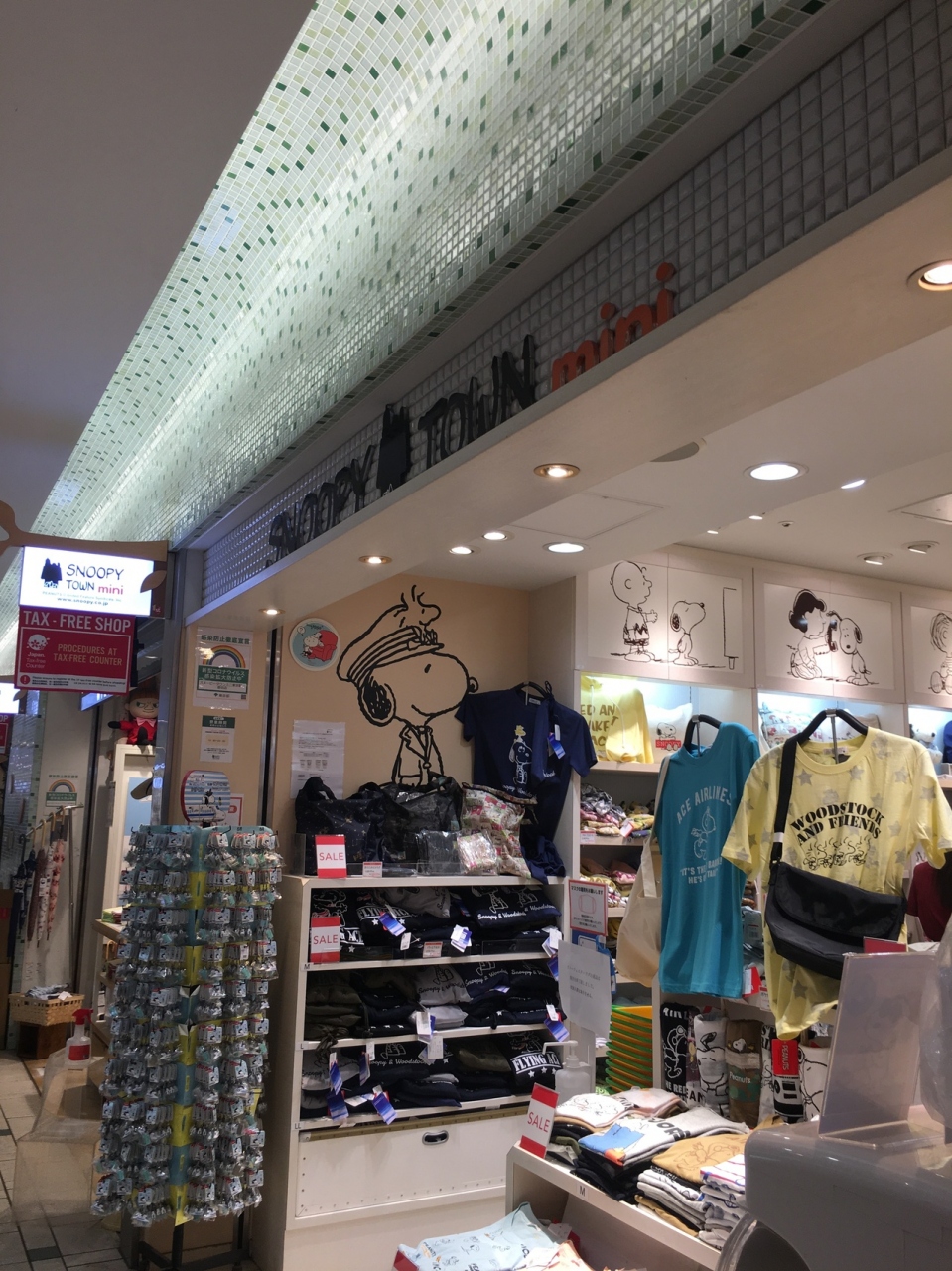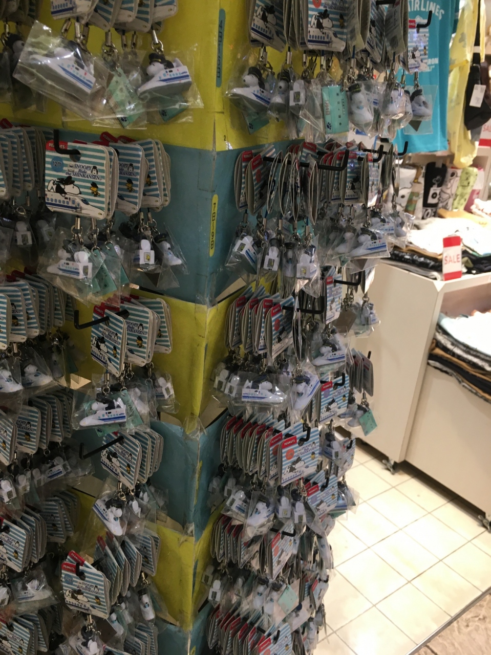 スヌーピーショップの専門店だけあって、商品数が多かったです。出入口にはキーホルダーがたくさん陳列されていて、新幹線に乗ったホルダーが可愛げでした。Tシャツの種類も豊富で、東京駅をデザインしたエコバックが斬新でした。