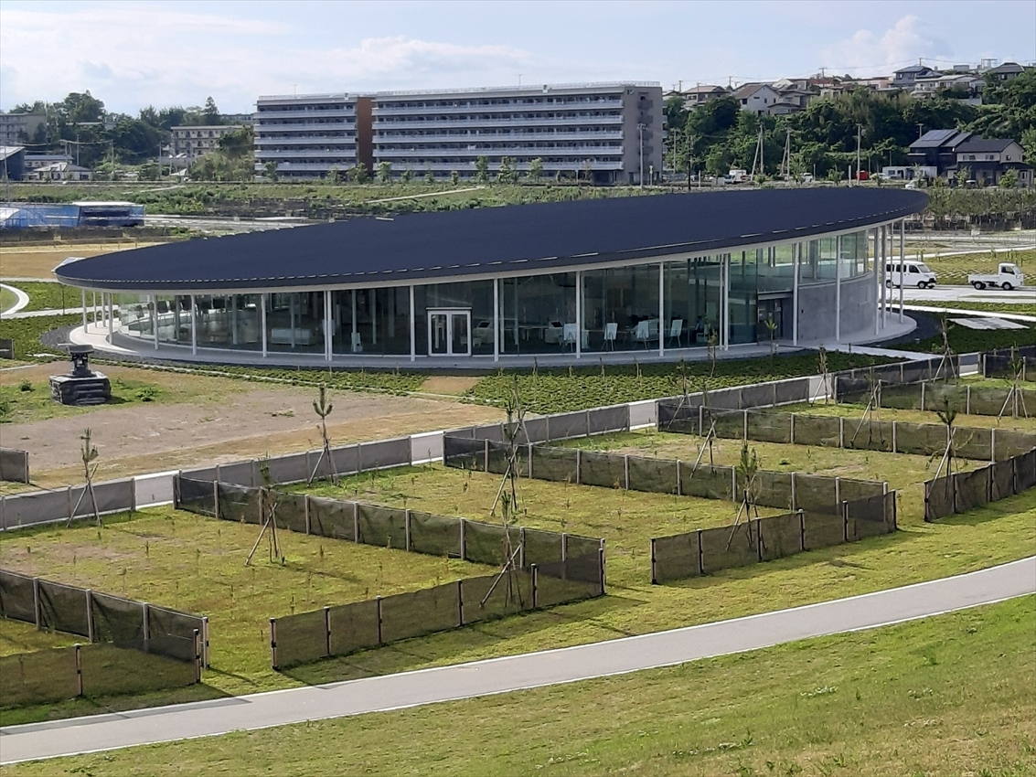 上記の祈念公園の敷地は約40haもありますが、伝承館は大きな円盤状のガラス張りの建物で見落とすことは有りません。