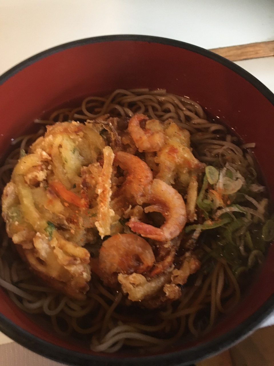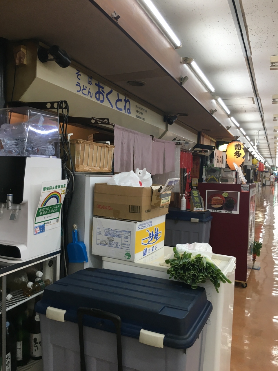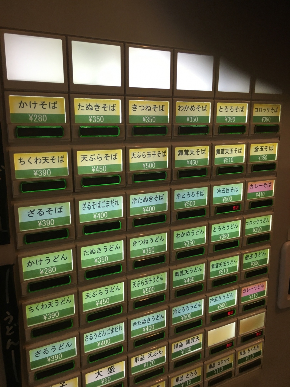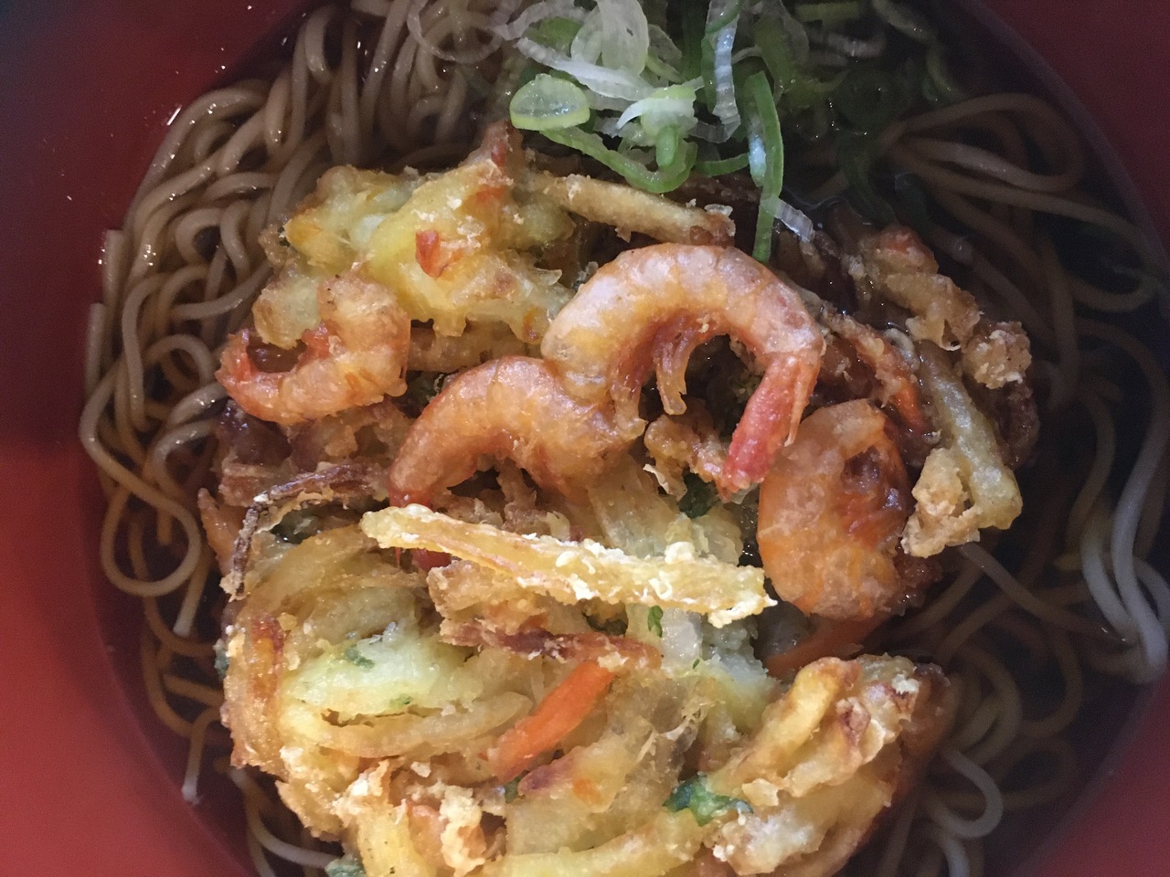 新橋駅前のビルの地下街にある、立ち食いのそばとうどんの店で、店内に現金専用の自動販売機が一つあります。天ぷらそばを食べました。ソーメンのようなそばで、天ぷらは汁に漬けてもブヨブヨにならないのが良かったです。小さな海老が数引き入っていました。