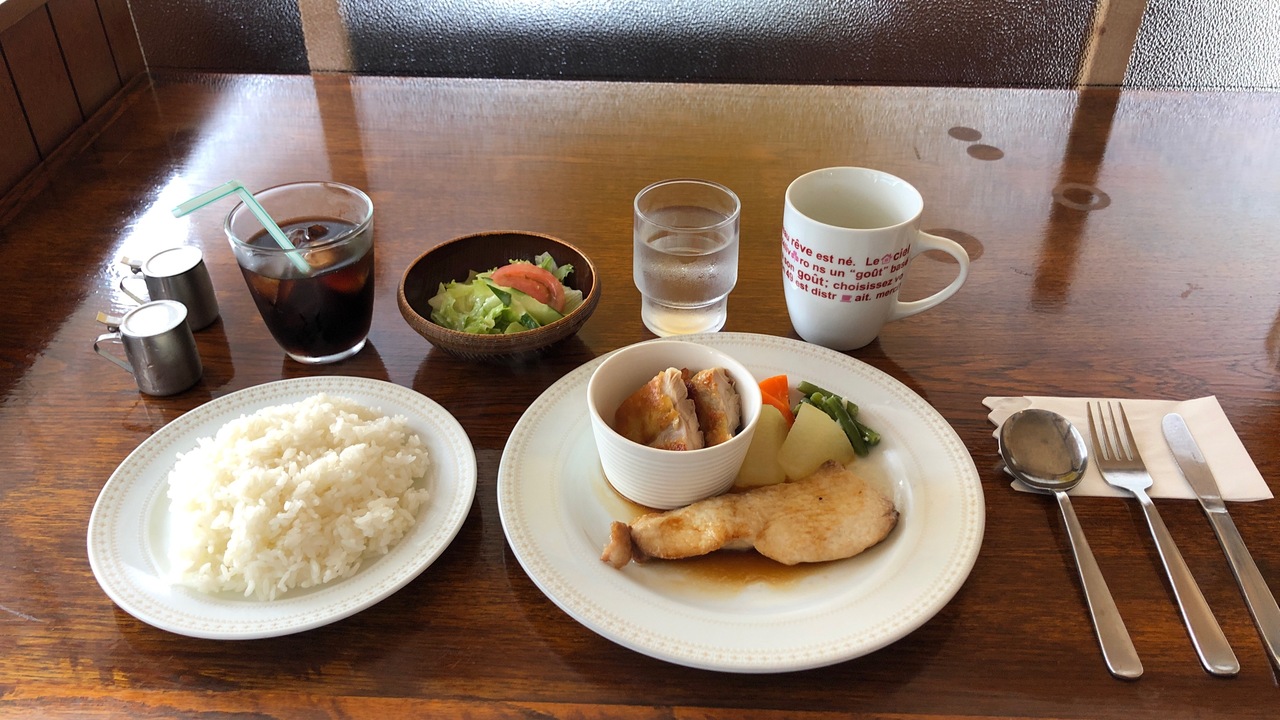 サンエーよぎ食品館の前にある洋食レストランです。ランチタイムの日替わりランチ750円を食べました。白身魚のソースやサラダのドレッシング、コーンスープ、すべてが手作りの味で、とてもおいしかったです。ドリンク付きで750円は、とてもお手頃です。