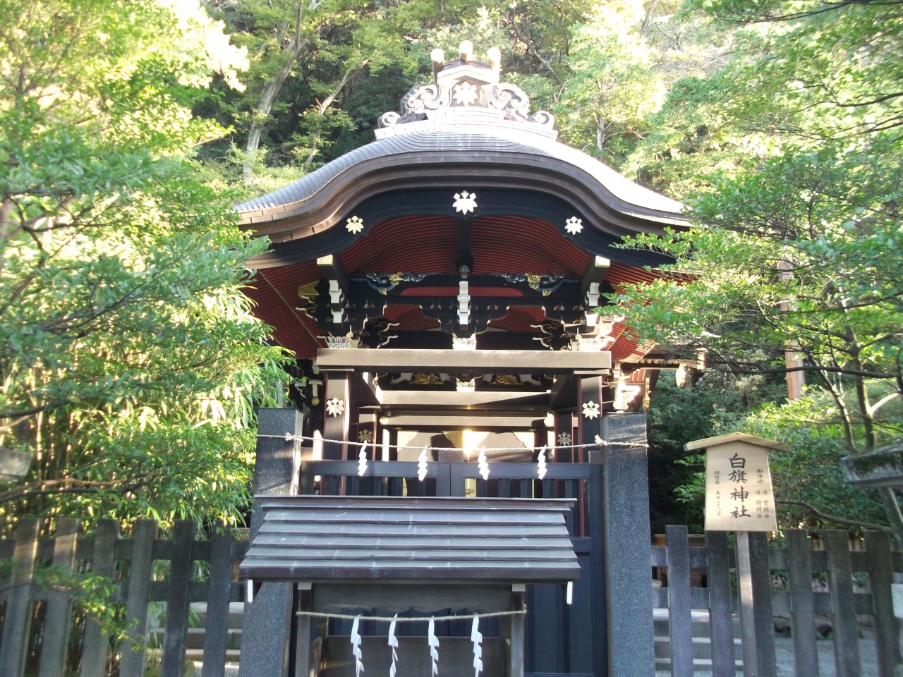 鶴岡八幡宮境内の舞殿から少し入ったところにある神社です。大きくはありませんが、源頼朝・実朝を祀るだけあって黒を基調とした堂々とした造りで重厚感があります。まわりは木々の緑に囲まれていて、いっそう映えて見えました。