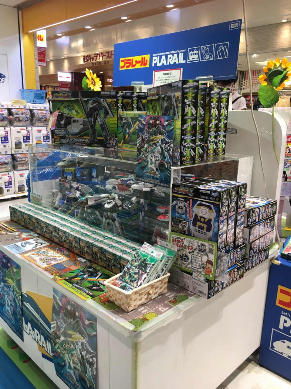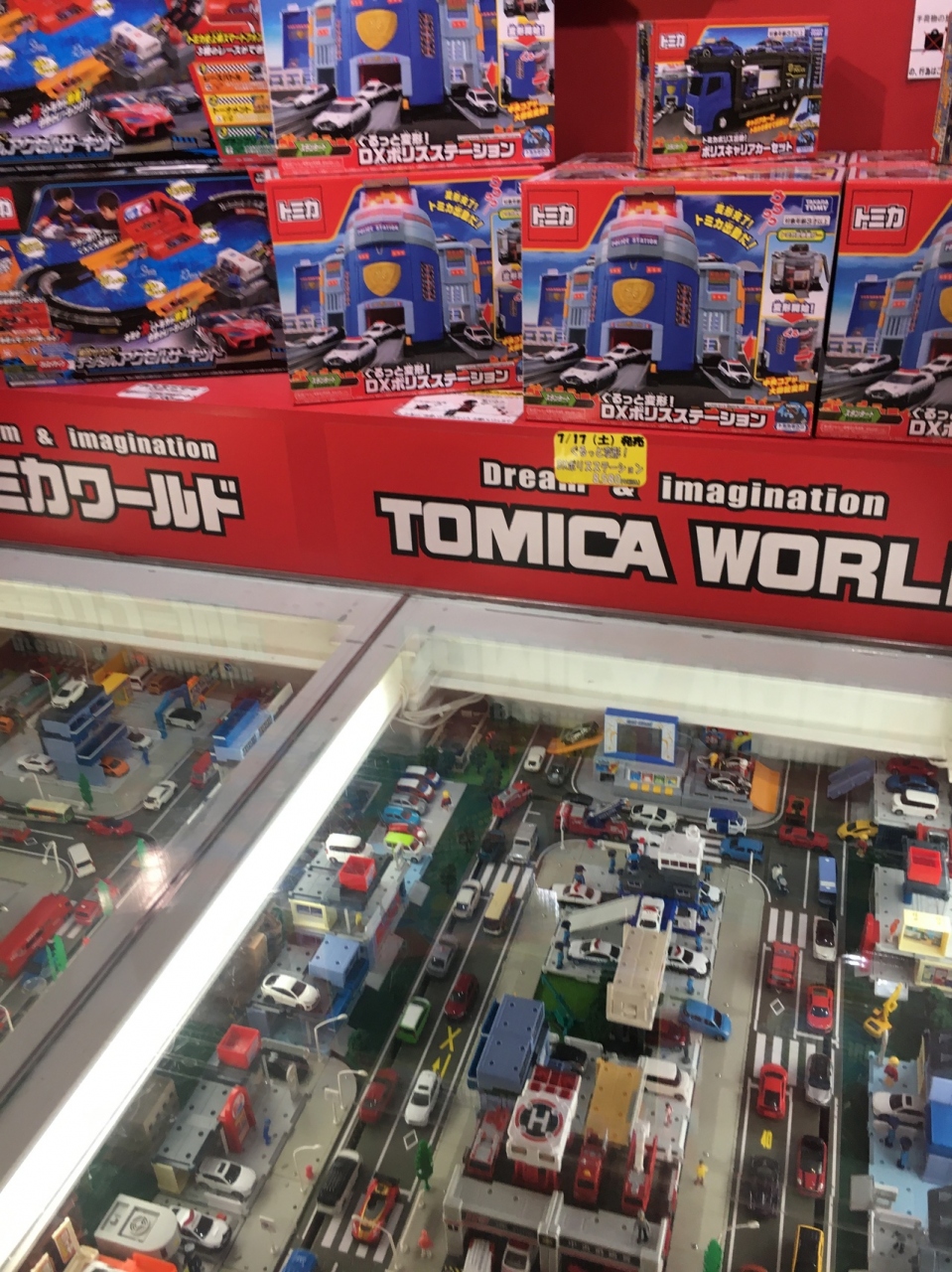 ぎっしり通り店内には、おもちゃが並び、ミニカーの種類が豊富でした。プラーレルの電車も多く置いてあり、線路がある模型には新幹線が走っていました。店内は親子連れがたくさんいましたが、ミニカーコーナーには昔の車もあるため大人も楽しめます。
