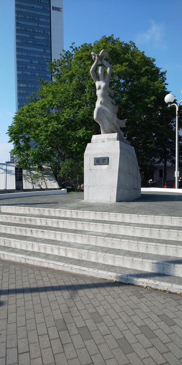 さっぽろテレビ塔の近くにある像です。石を彫って造られた像で、女性が鳥を両手に持って放そうとしている瞬間のような、そんなデザインとなっています。