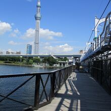隅田川を渡っている東武鉄道の鉄橋の下が、歩いて渡れるようになっていました。真上を浅草駅を発着する東武鉄道が通るので、音などで少しドキドキしますが、車も通らないので安全な橋でした。川の眺めがとても良くて気に入りました。