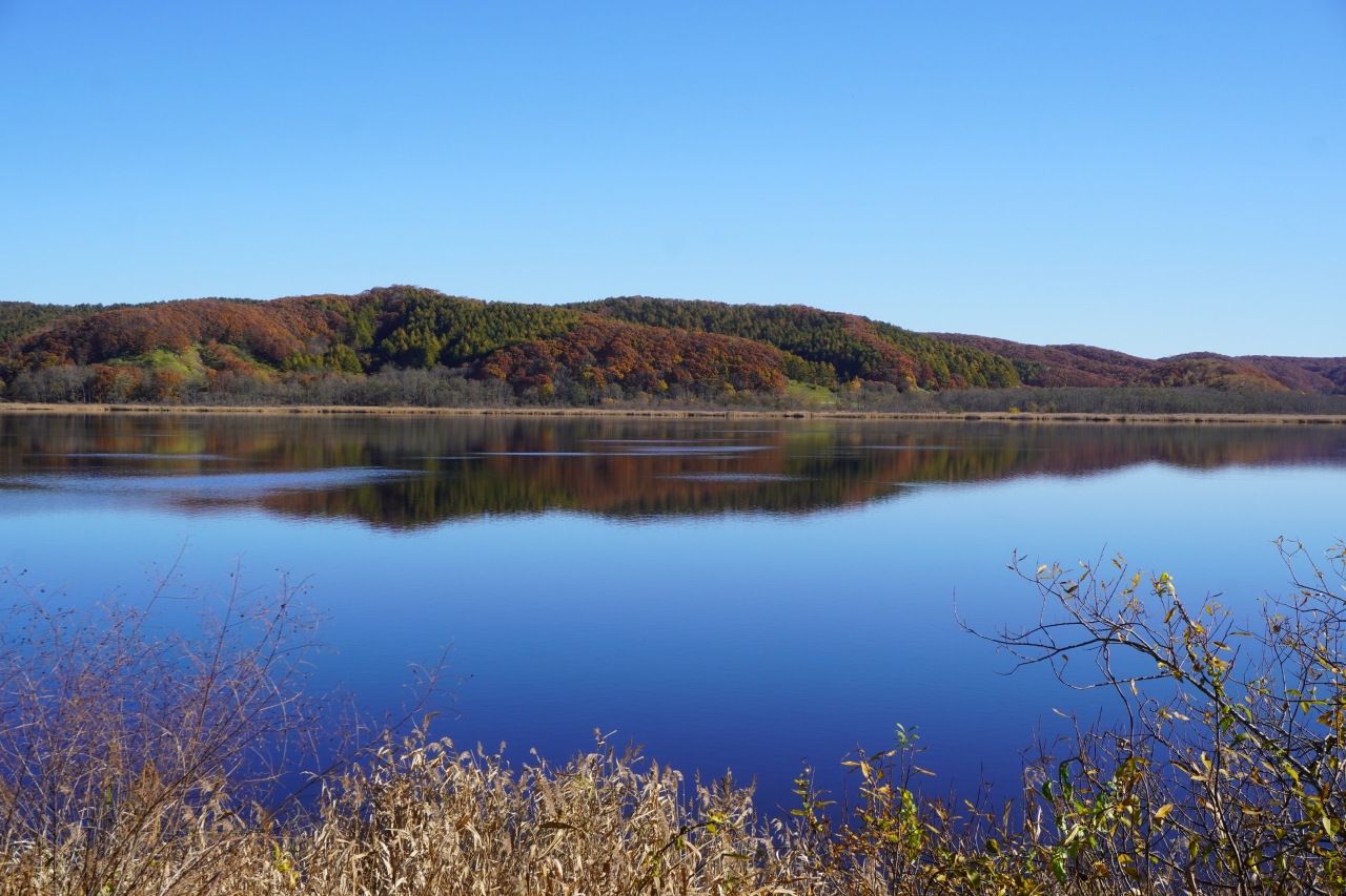 達古武沼は一番南側。釧路湿原駅から遊歩道で歩けるので、三つの湖の中では一番アクセスはいいと思います。周囲は4.9 kmあって、視界も開けています。穏やかな水面に周囲の紅葉が映ってとても美しい眺めでした。