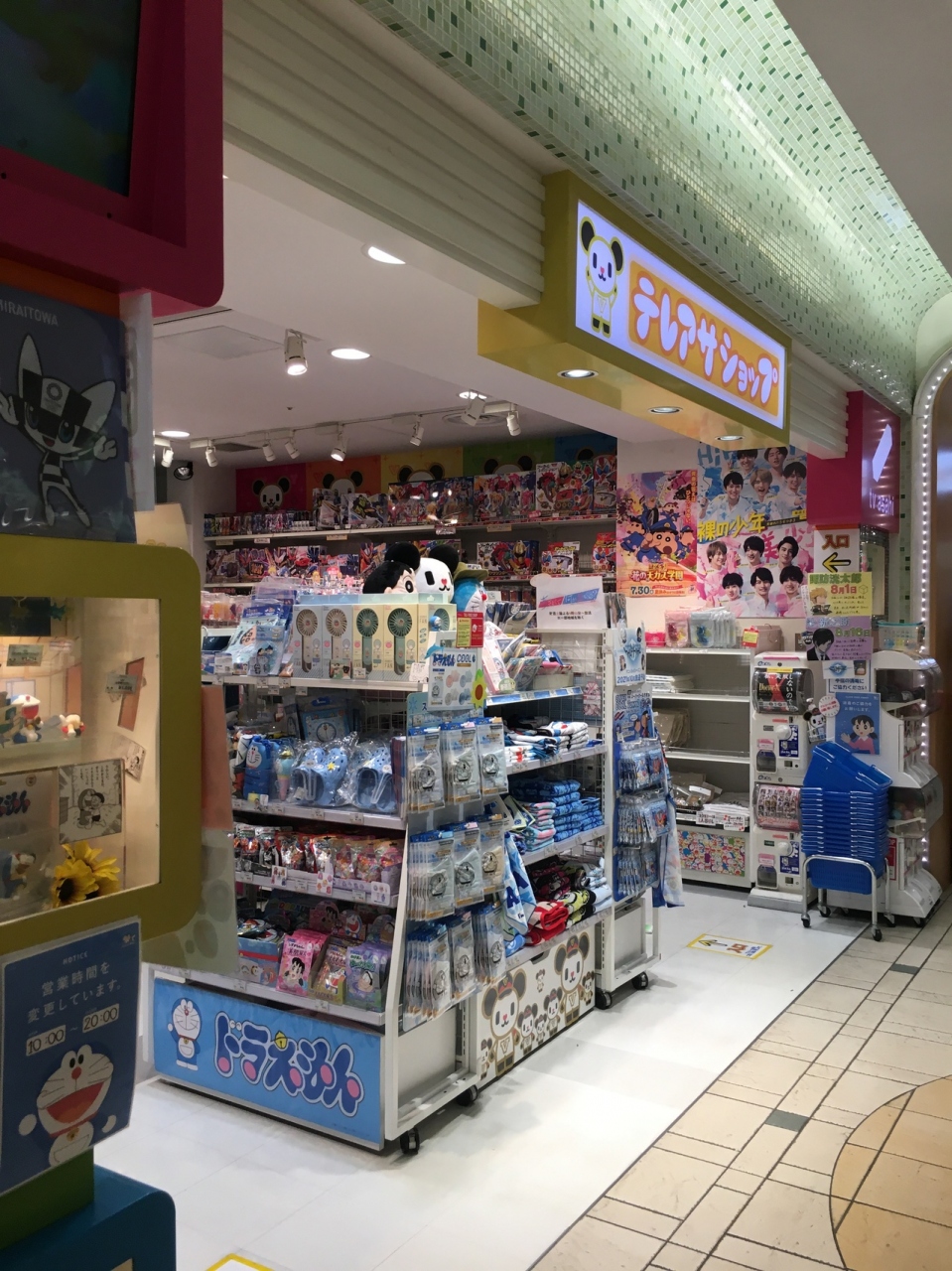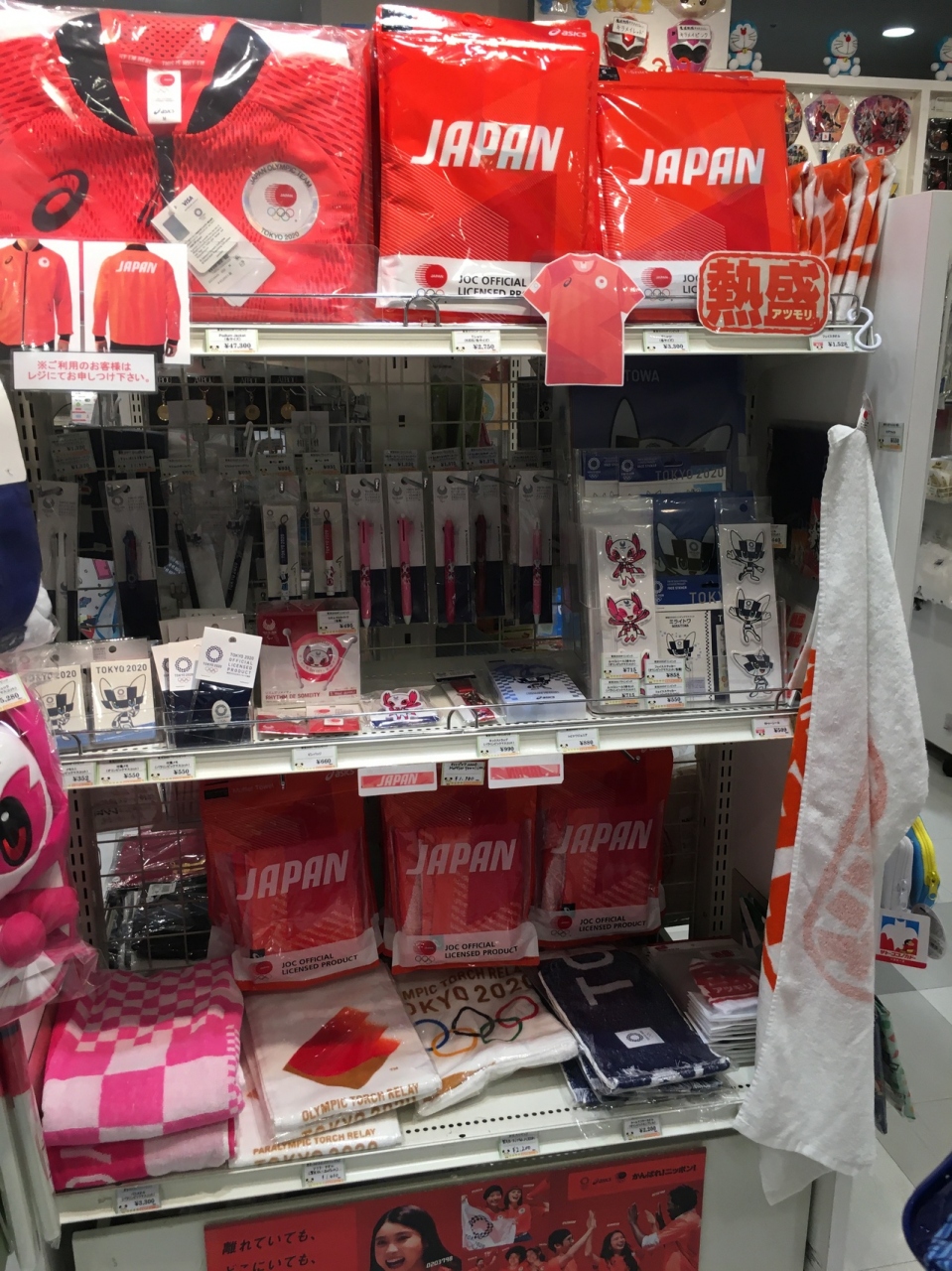 持ち歩きに便利なミニ扇風機が店内入って直ぐの場所に置いてありました。ドラえもんグッズコーナーは大きめでした。東京オリンピック商品のグッズもあり、タオル、Tシャツ、ポールペン等が置いてありました。テレビで見るキャラクター商品ばかりでした。
