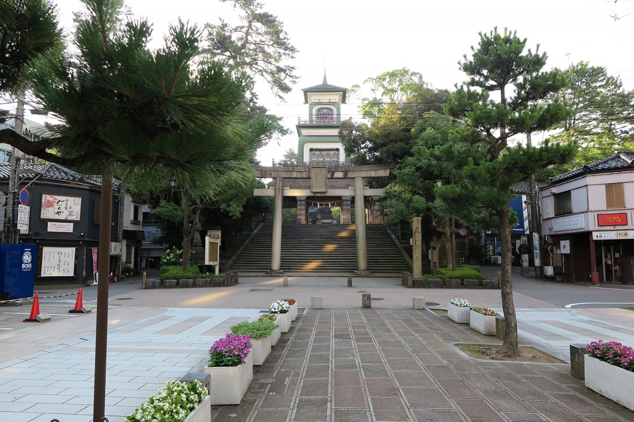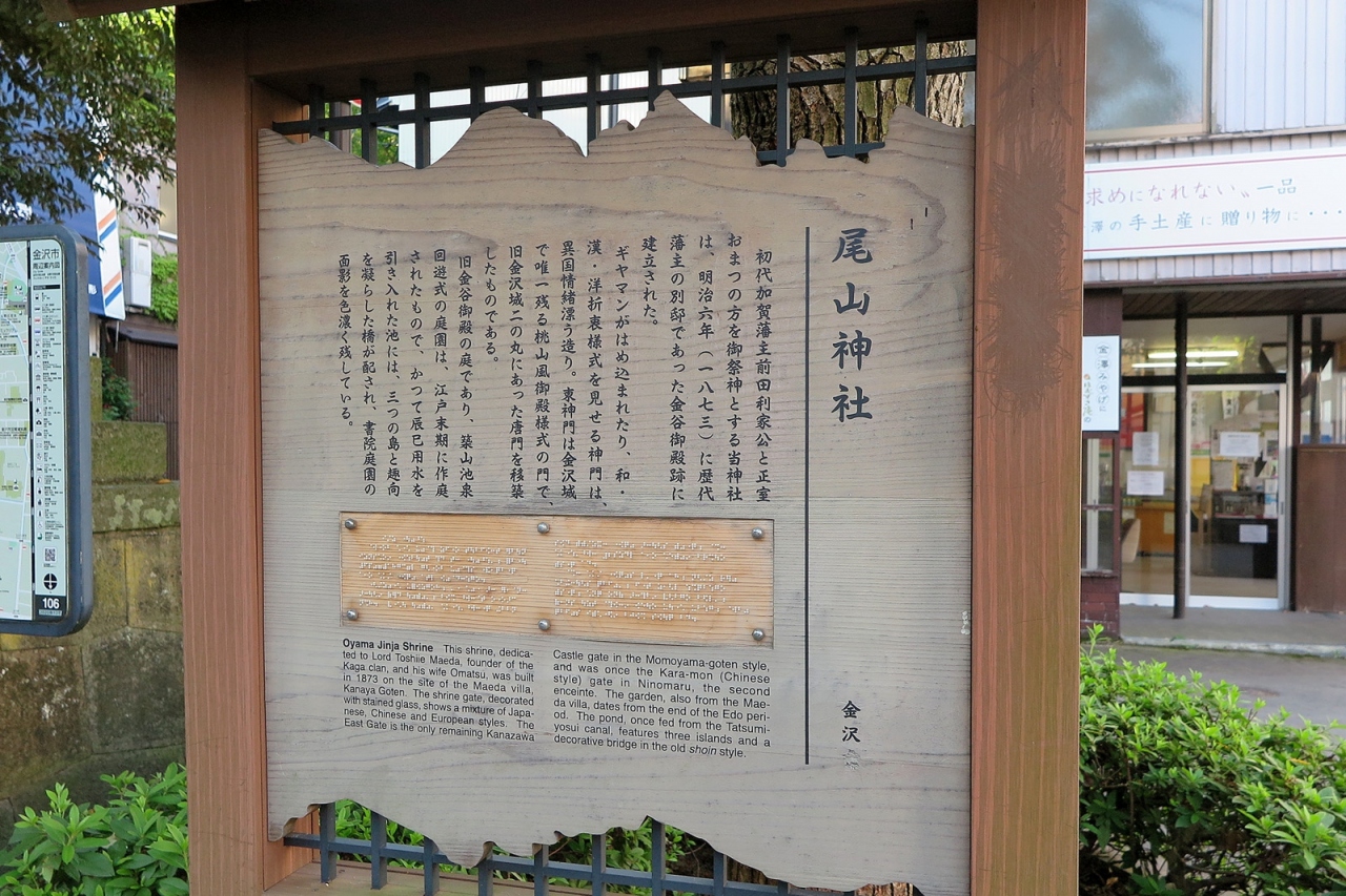 金沢を代表する観光名所となっている「尾上神社」ですが、その場所が金沢の中心地である武蔵ケ辻と香林坊の中間点にあるため、今まで訪れたことがありませんでした。実際に訪れてみると、たしかに観光名所になるに相応しい神社でした。和・漢・洋折衷の「神門」、旧金沢城二ノ丸唐門を移築した「東神門」、旧金谷御殿の「神苑」など見所満載です。