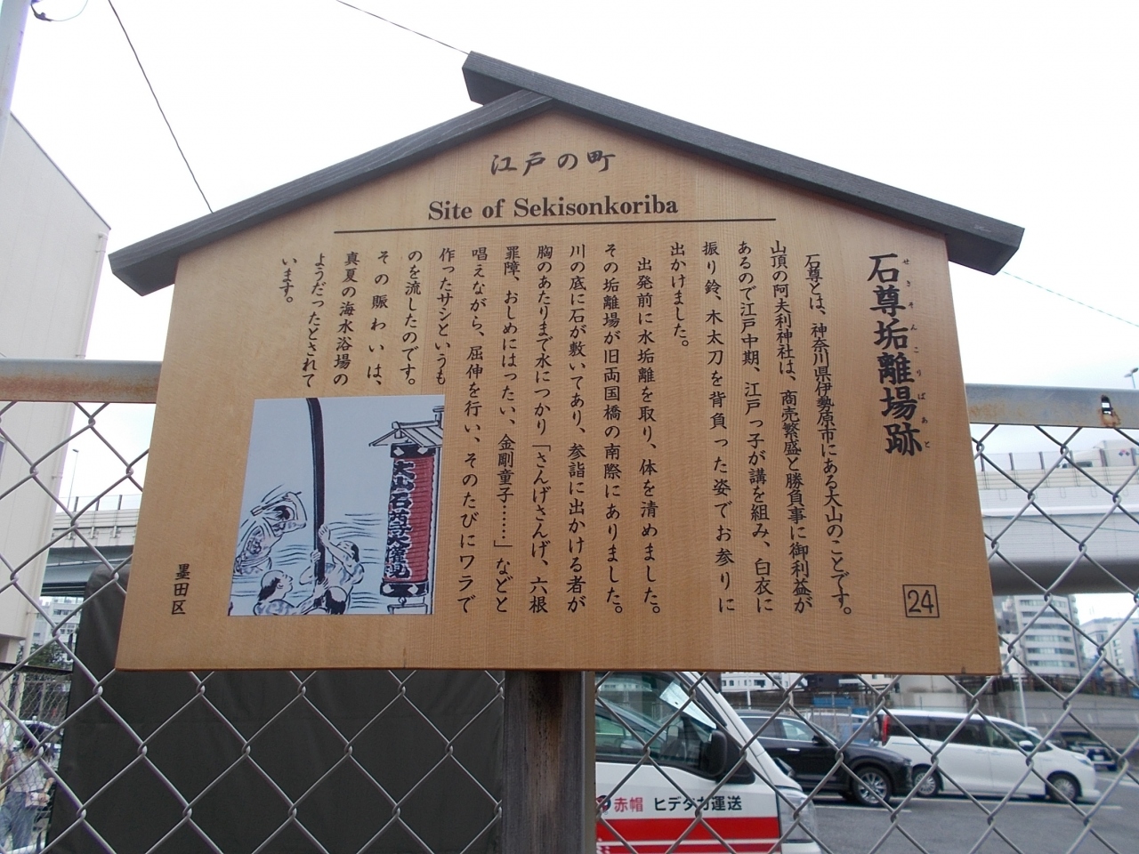 この高札・石尊垢離場跡は両国橋の東のたもとにあったのです。その跡に説明板(高札)がたてられています。この辺りは広小路と呼ばれ火除け血として広い空き地となっていたのです。そこに江戸時代行われた大山詣りに行く前にこの場所で体を記よまたのです。その状況を説明板が紹介しています。今は遺構は何もないです。
