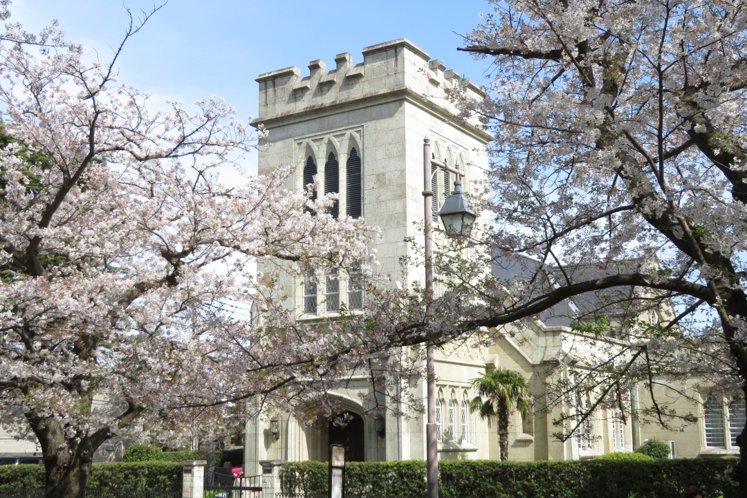 山手地区には、多くの洋館群が点在していますが、この教会はその横浜山手地区の一角に位置しています。大谷石を使った重厚な建物で、それだけでも存在感があります。訪問時は春、ちょうど桜が満開で、建物と桜の組み合わせが美しかったです。