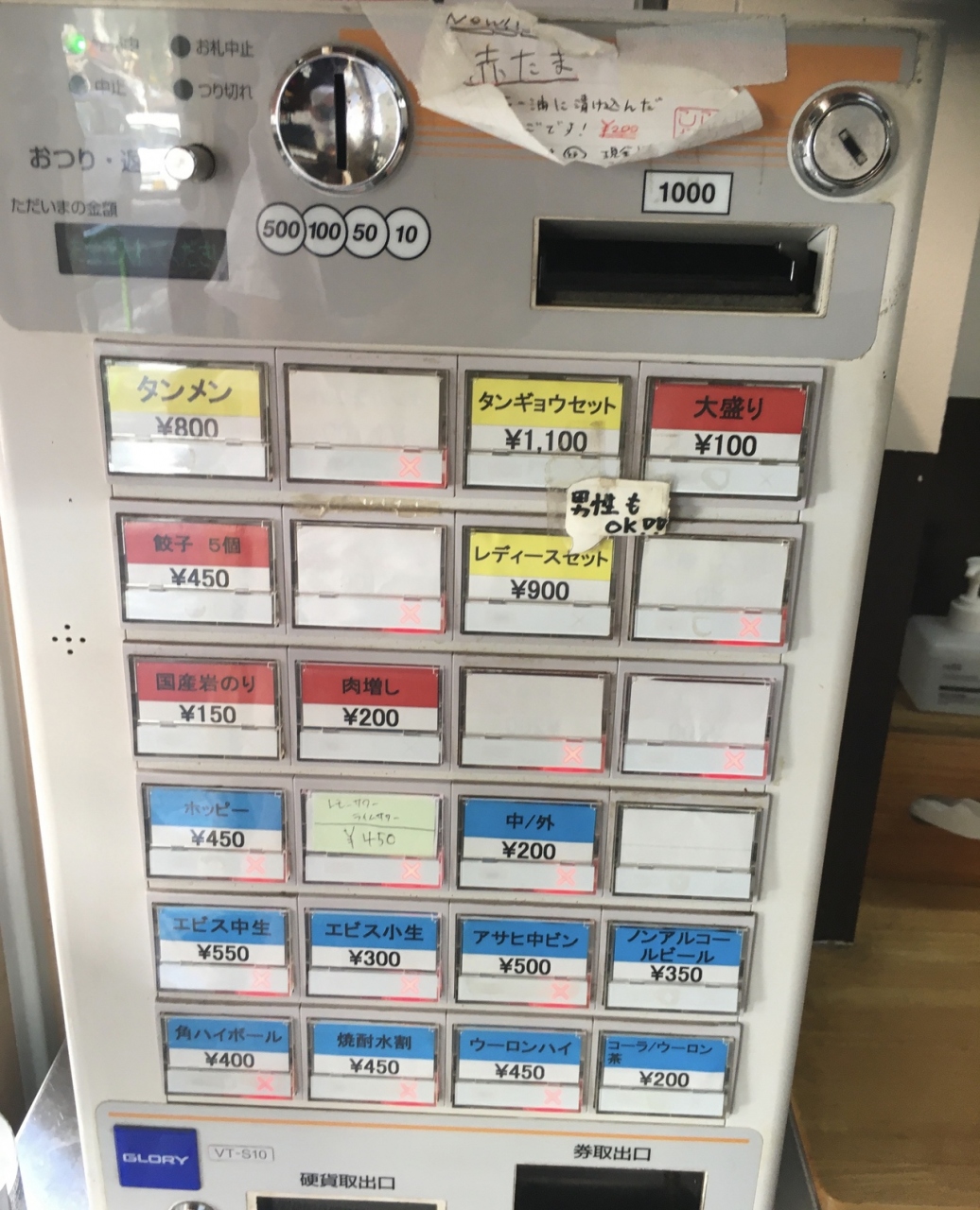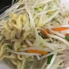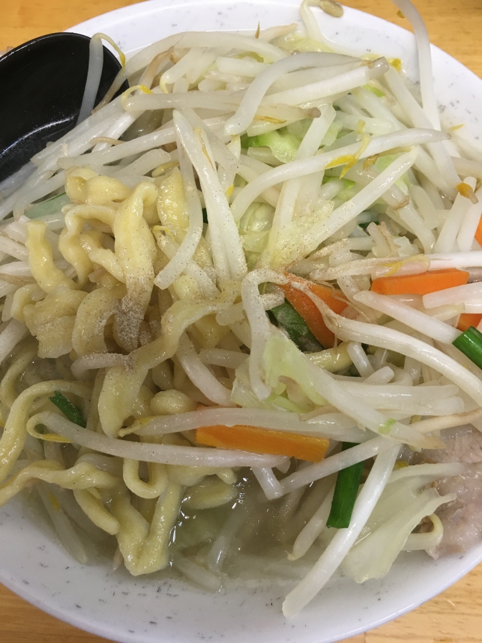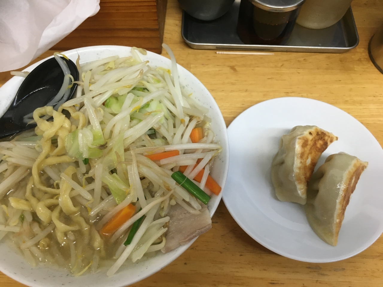 カウンター10席ほど、2人掛けのテーブルが3つあり、小さな自動食券機が一つありました。タンメンと餃子、飲み物しかメニューがなく、レディスセットを食べました。男性も注文出来ます。通常のセットはタンメンに餃子5個付きますが、餃子2個付きです。注文してから出てくるまで10分ぐらいかかりました。うどんのような太麺で、もやしを中心とした野菜が山盛りになっていてスープはあっさり味付けでした。餃子は中身の具が多いです。