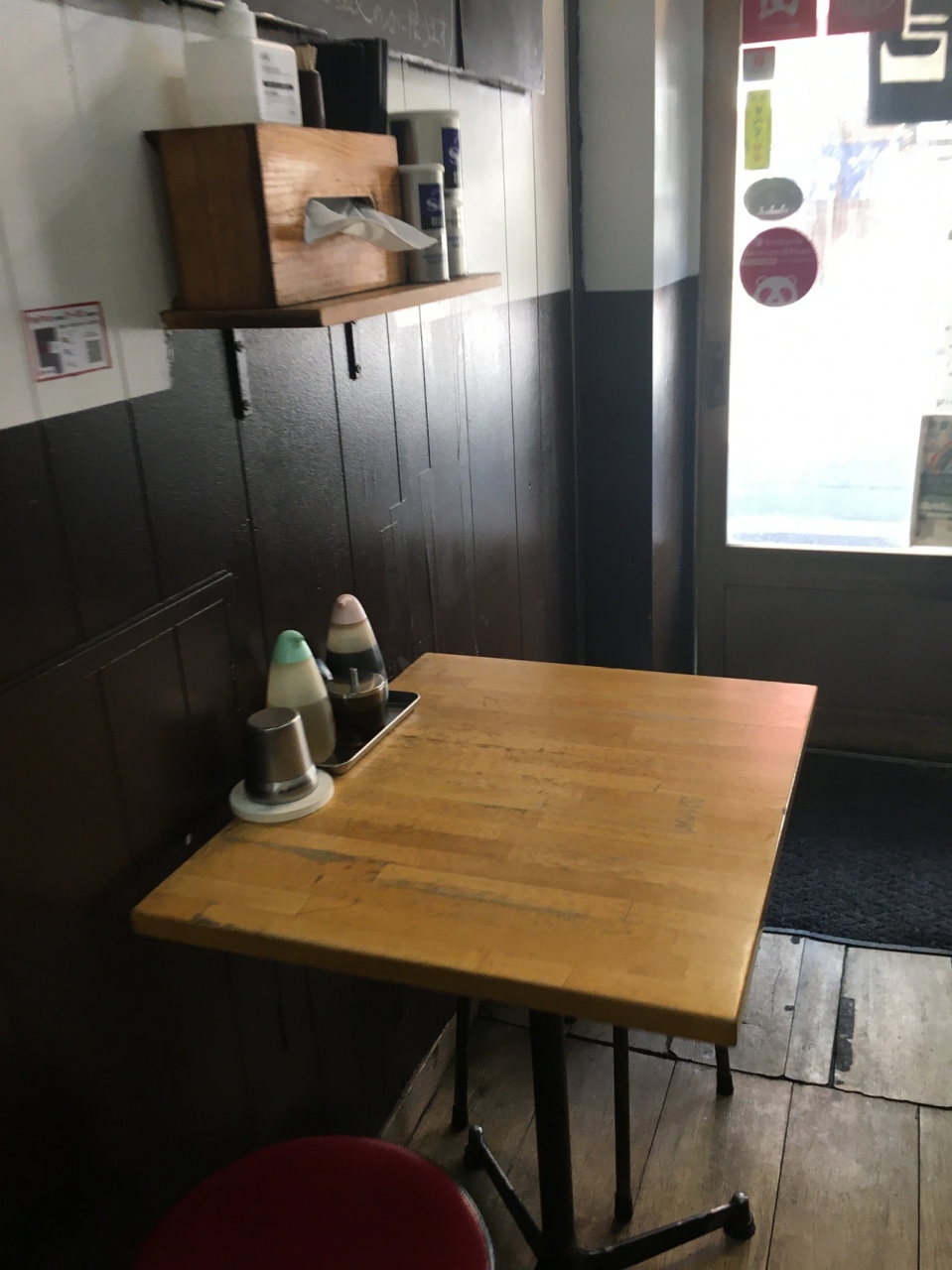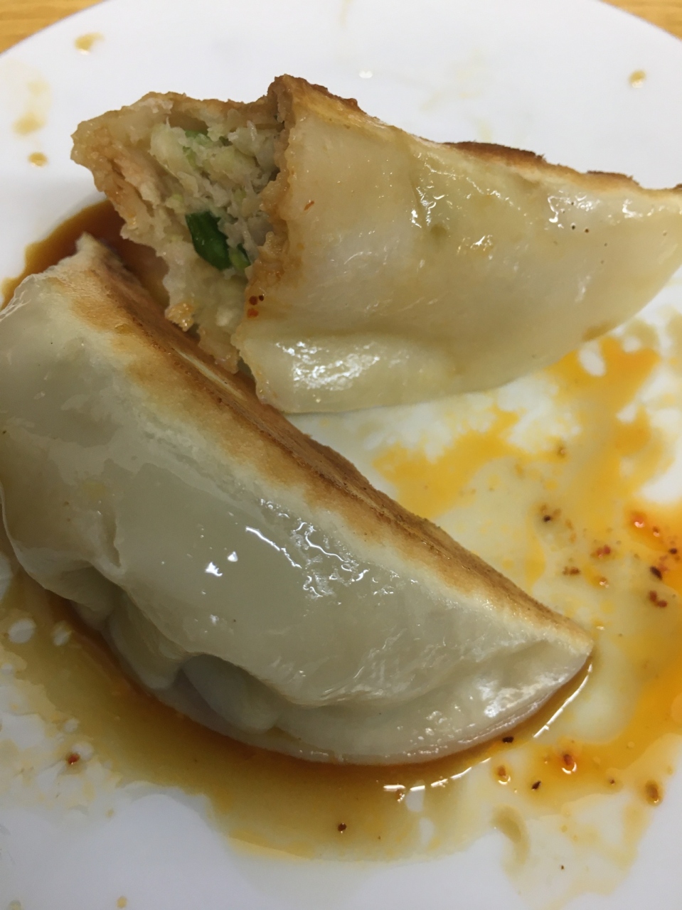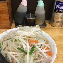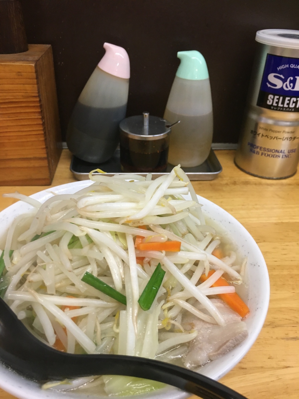 カウンター10席ほど、2人掛けのテーブルが3つあり、小さな自動食券機が一つありました。タンメンと餃子、飲み物しかメニューがなく、レディスセットを食べました。男性も注文出来ます。通常のセットはタンメンに餃子5個付きますが、餃子2個付きです。注文してから出てくるまで10分ぐらいかかりました。うどんのような太麺で、もやしを中心とした野菜が山盛りになっていてスープはあっさり味付けでした。餃子は中身の具が多いです。